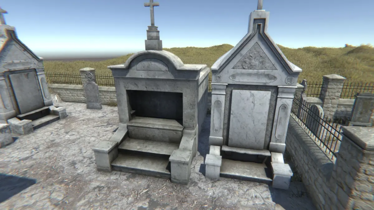-24 graves/tombs/headstones (from 1200 verts to 50). Some have an extra material with letter/inscriptions on the graves.