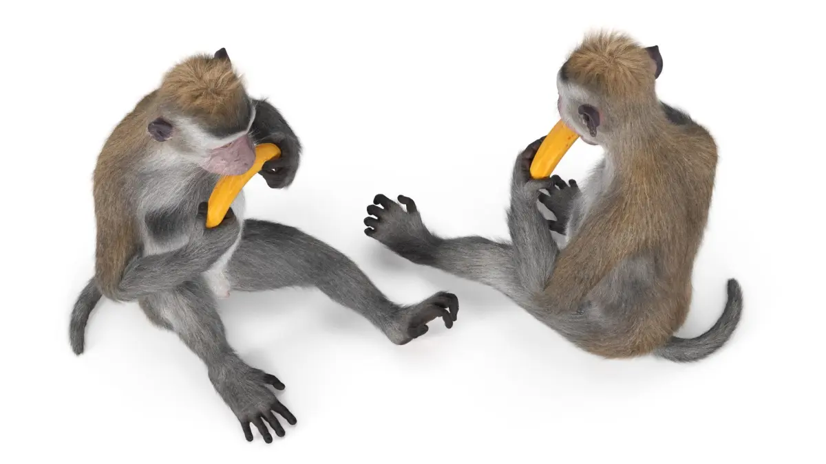 Gray Rhesus Macaque Eating Banana Fur for Mayahas a Vray Fur modifier, hair customizable (hair count, hair segments, hair color, root size, tip size, etc).