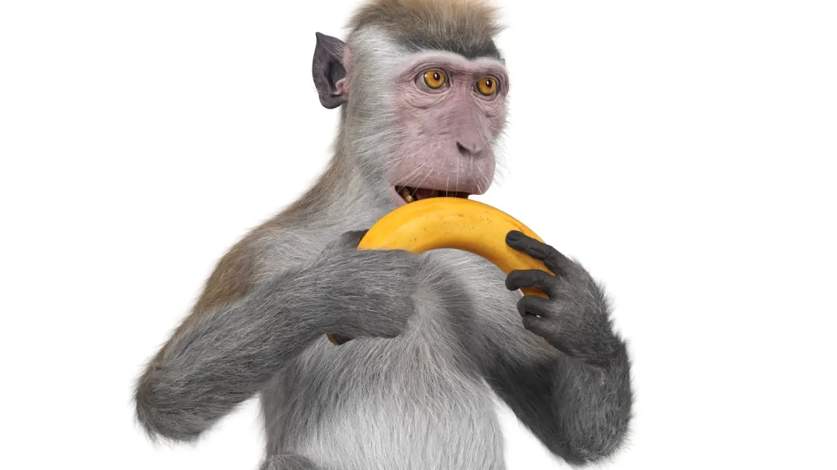 Gray Rhesus Macaque Eating Banana Fur for Maya is a three-dimensional model of a primate in a seated position, holding and biting into a banana, with realistic fur detailing and natural body proportions.