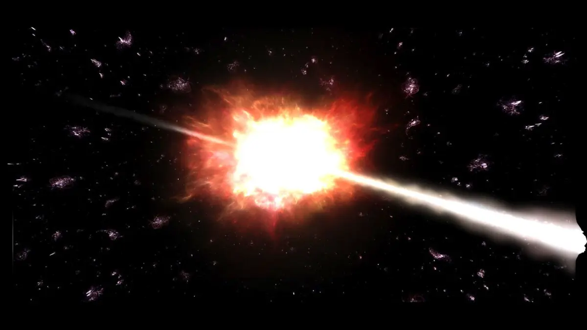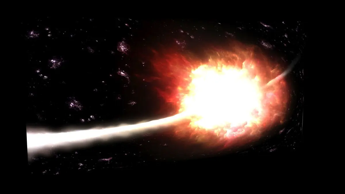 DescriptionGRB 090423. This GRB 090423 is like a comet that's passing through the supernova explosion. GRB 090423 was a gamma-ray burst (GRB) detected by the Swift Gamma-Ray Burst Mission on April 23, 2009, at 07:55:19 UTC whose afterglow was detected in the infrared and enabled astronomers to determine that its redshift is z = 8.2, making it one of the most distant objects detected at that time with a spectroscopic redshift (GN-z11, discovered in 2016, has a redshift of 11). A gamma-ray burst is an extremely luminous event flash of gamma rays that occurs as the result of an explosion, and is thought to be associated with the formation of a black hole. The burst itself typically only lasts for a few seconds, but gamma-ray bursts frequently produce an afterglow at longer wavelengths that can be observed for many hours or even days after the burst. Measurements at these wavelengths, which include X-ray, ultraviolet, optical, infrared, and radio, enable follow-up study of the event. The finite speed of light means that GRB 090423 is also one of the earliest objects ever detected for which a spectroscopic redshift has been measured. The universe was only 630 million years old when the GRB occurred, and its detection confirms that massive stars were born and dying even very early on in the life of the universe. GRB 090423 and similar events provide a unique means of studying the early universe, as few other objects of that era are bright enough to be seen with today's telescopes. On April 23, 2009, at 07:55:19 UTC the Swift satellite detected a burst that lasted about 10 seconds and was located in the direction of the constellation Leo. Swift localized the field in which GRB 090423 occurred, and 77 seconds after the burst, the Swift UVOT Photometric System took a 150-second exposure of the field, but was unable to detect an optical or ultraviolet afterglow. A few minutes after its discovery, ground-based telescopes began observing the field. Within 20 minutes of the burst, Nial Tanvir and his team found an infrared source at the Swift position using the United Kingdom Infrared Telescope (UKIRT) on Mauna Kea, Hawaii. The initial observations taken by UKIRT were triggered autonomously via the eSTAR Project. They observed a drop off in flux beyond 1.13 micrometres with the VLT. Attributing this drop off to Lyman alpha absorption by neutral hydrogen in the intergalactic medium, they calculated a redshift of 8.2 for GRB 090423. The team of C.C. Thöne and Paolo D'Avanzo observed the afterglow of GRB 090423 using the Italian TNG 3.6m telescope located in the Canary Islands, Spain. They obtained two hours of spectra, which when combined, suggested a very weak signal at the position of the afterglow. They too saw a drop off in flux near 1.1 micrometres, and reported a redshift of 8.1 for GRB 090423, which is consistent, within error, of the redshift reported by Tanvir et al. The redshift of 8.1 suggest the burst may have lasted approximately 1.2 seconds in the local frame of the emitter, its duration being redshifted accordingly to the observed 10 seconds. The intergovernmental astronomy organisation, European Southern Observatory (ESO) operates the Very Large Telescope that obtained the spectrum reported by Tanvir et al. The GRB was not visible in Chile when Swift first detected the burst at 07:55 UTC, but was the following day at 03:00 UTC, which enabled the Gamma-Ray Burst Optical/Near-Infrared Detector (GROND) at La Silla Observatory to make observations of the burst, and find a photometric redshift consistent with the value reported elsewhere. The last observers to gather data during the event was the Combined Array for Research in Millimeter-wave Astronomy (CARMA) observatory. The observation of GRB 090423 by CARMA was taken at a frequency of 92.5 GHz. While the afterglow was not detected, they were able to place a 3-sigma upper limit of 0.7 mJy on the flux density of the afterglow.