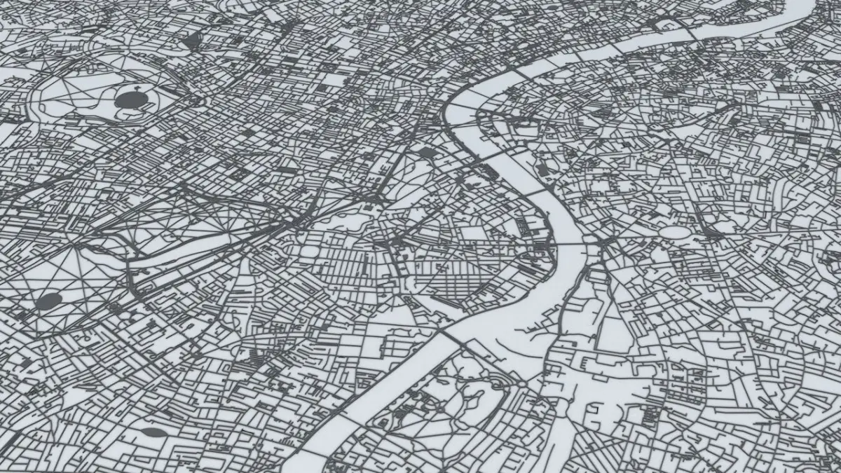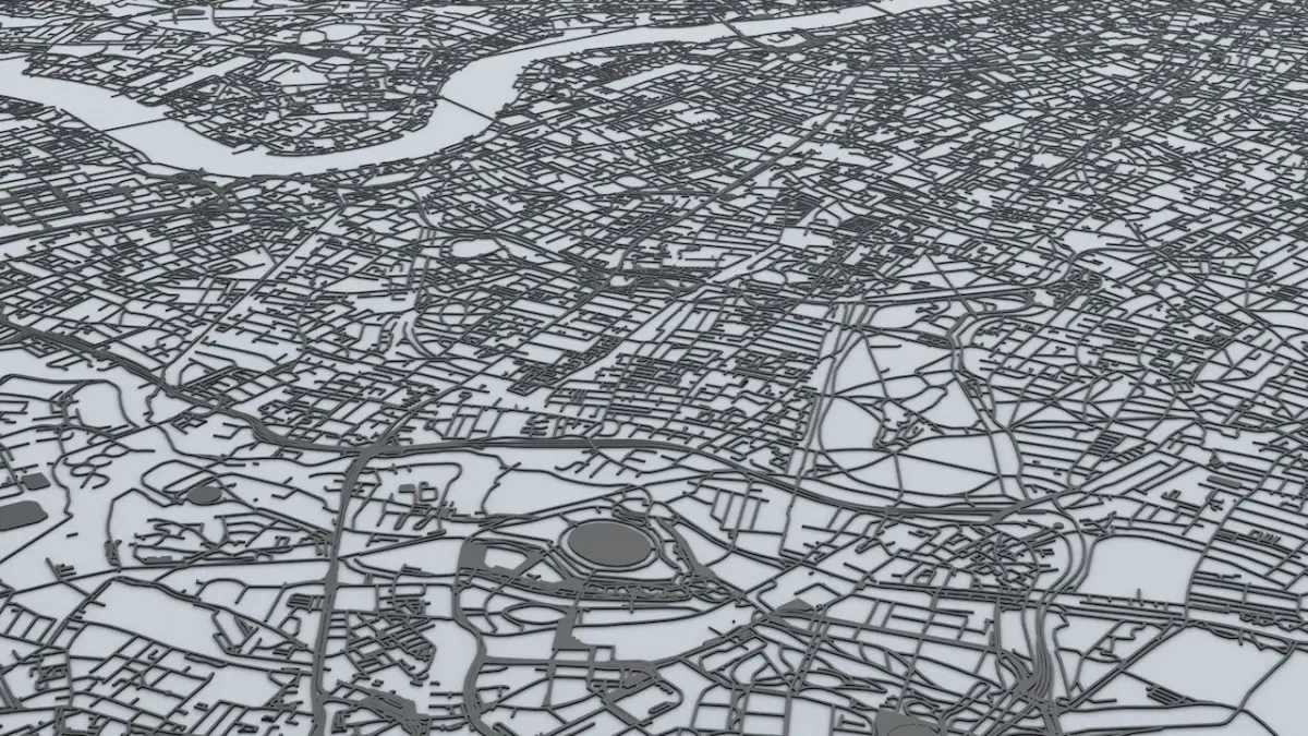 - the model is positioned on a flat surface (road network is on the “floor” - no elevation data included)