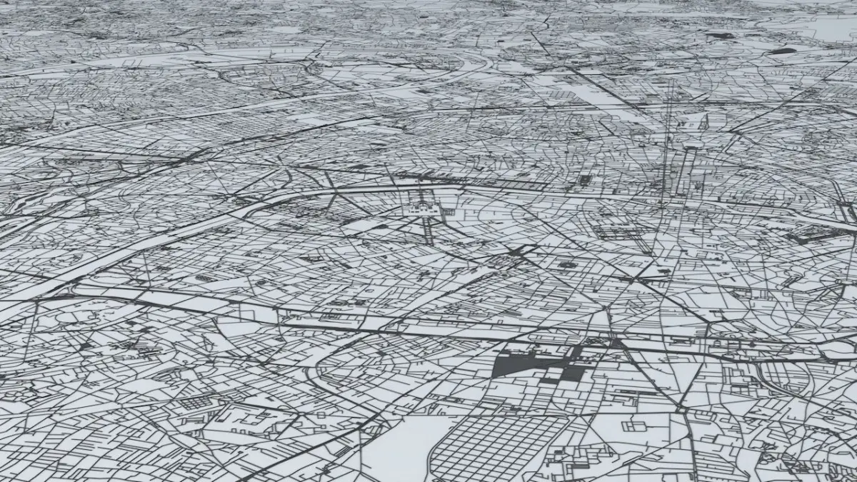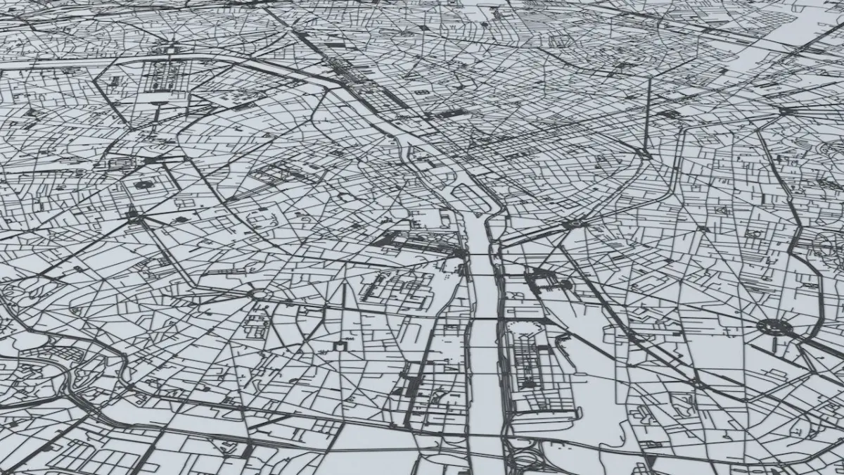 - the model is positioned on a flat surface (road network is on the “floor” - no elevation data included)