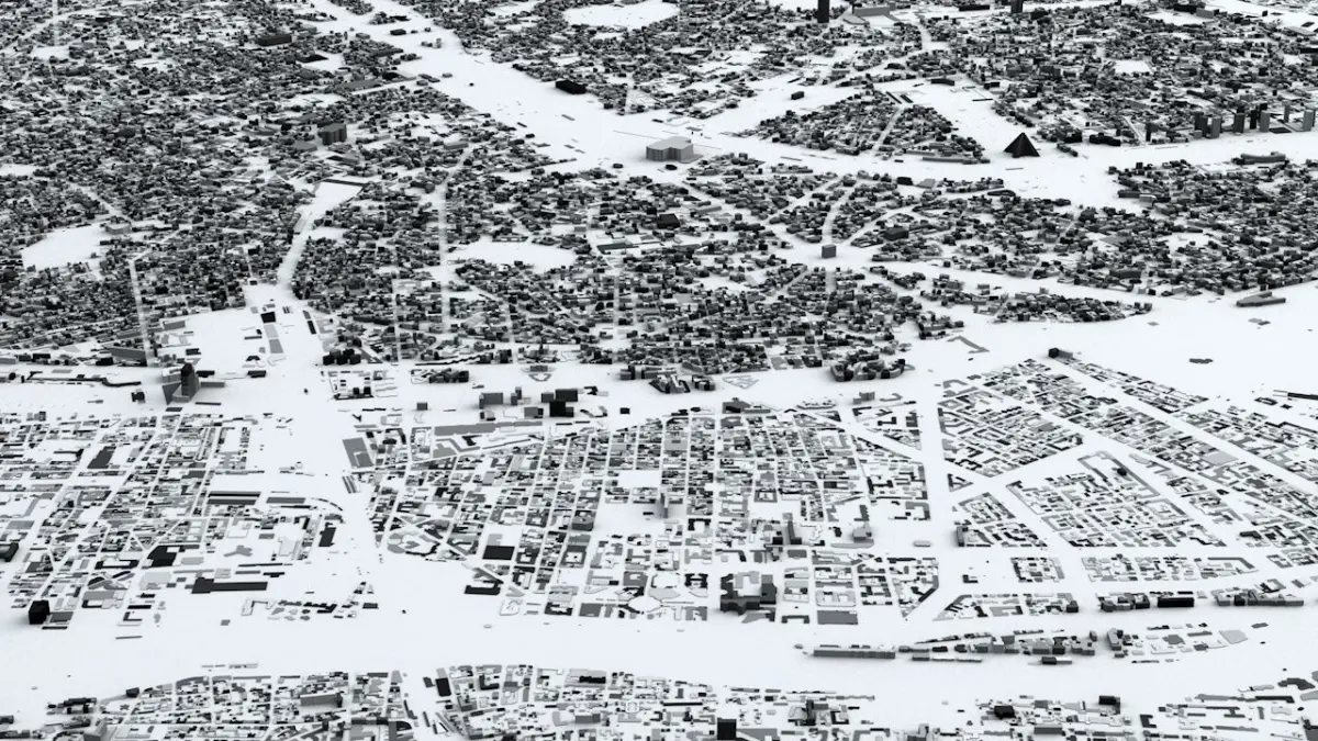 - the model is positioned on a flat surface (all buildings are on the “floor” - no elevation data included)