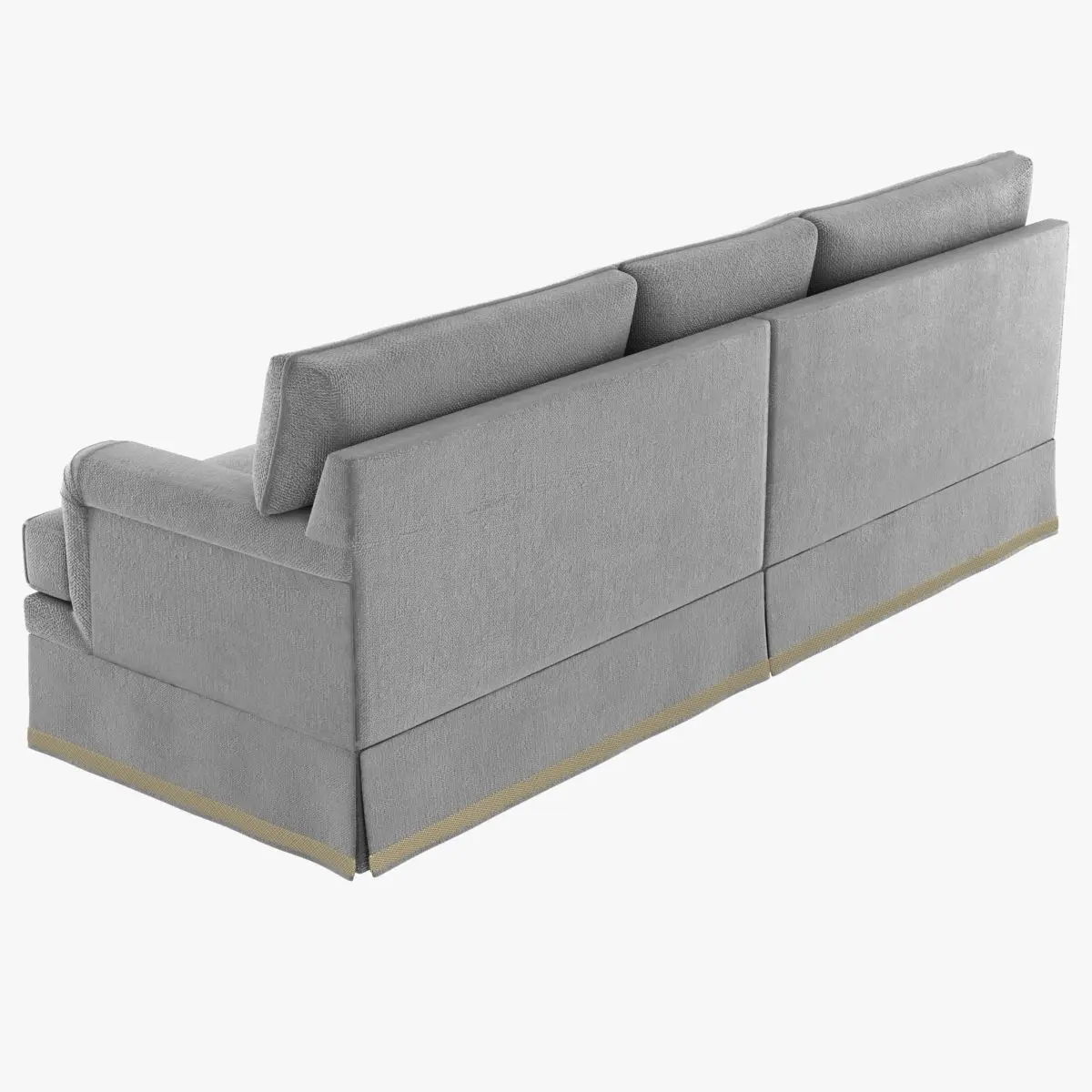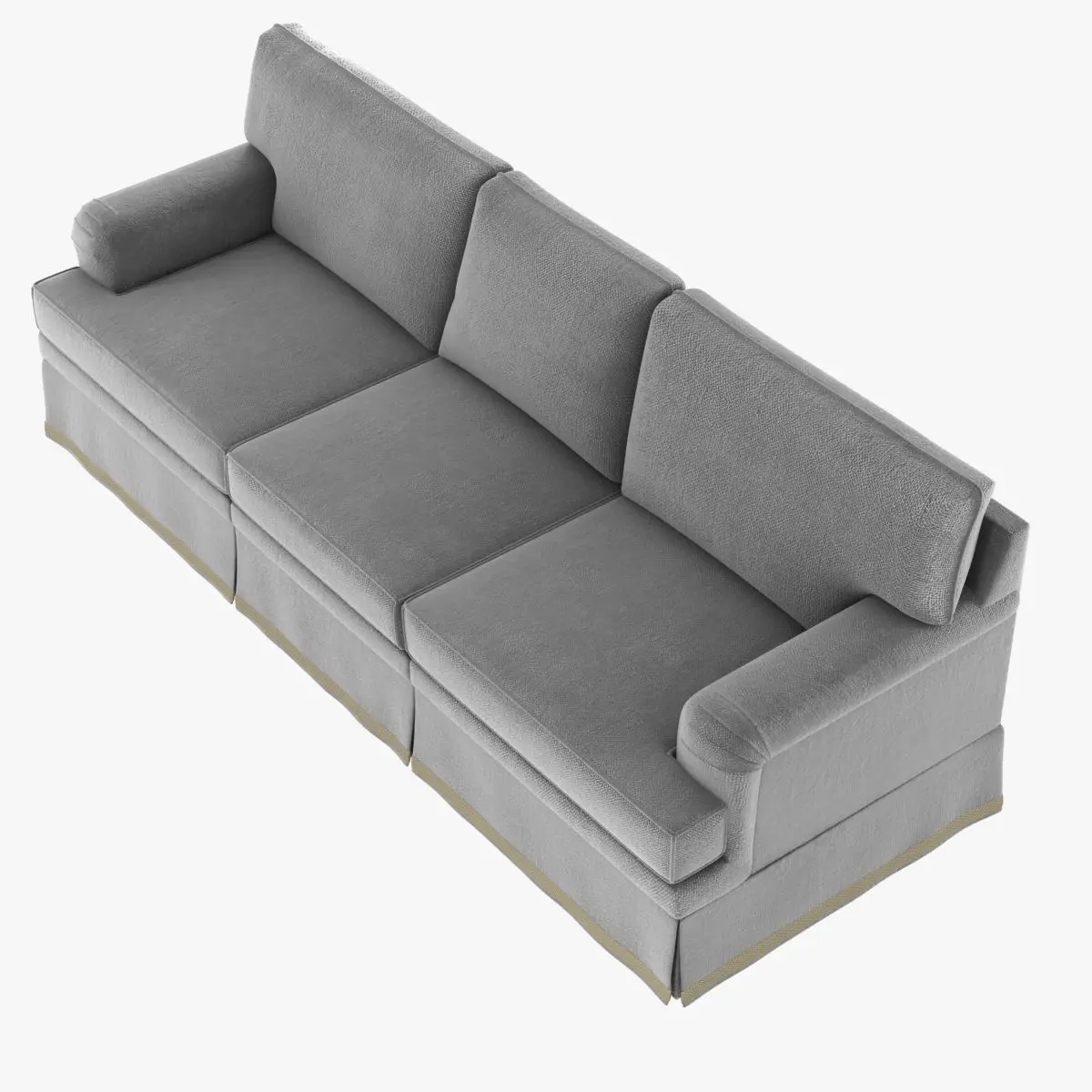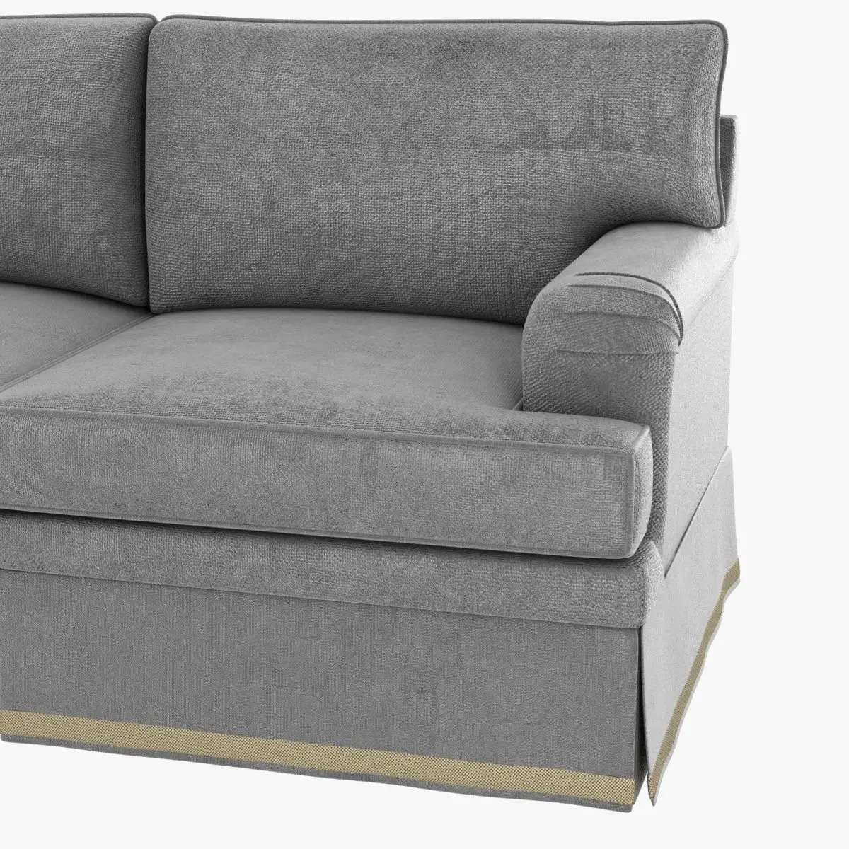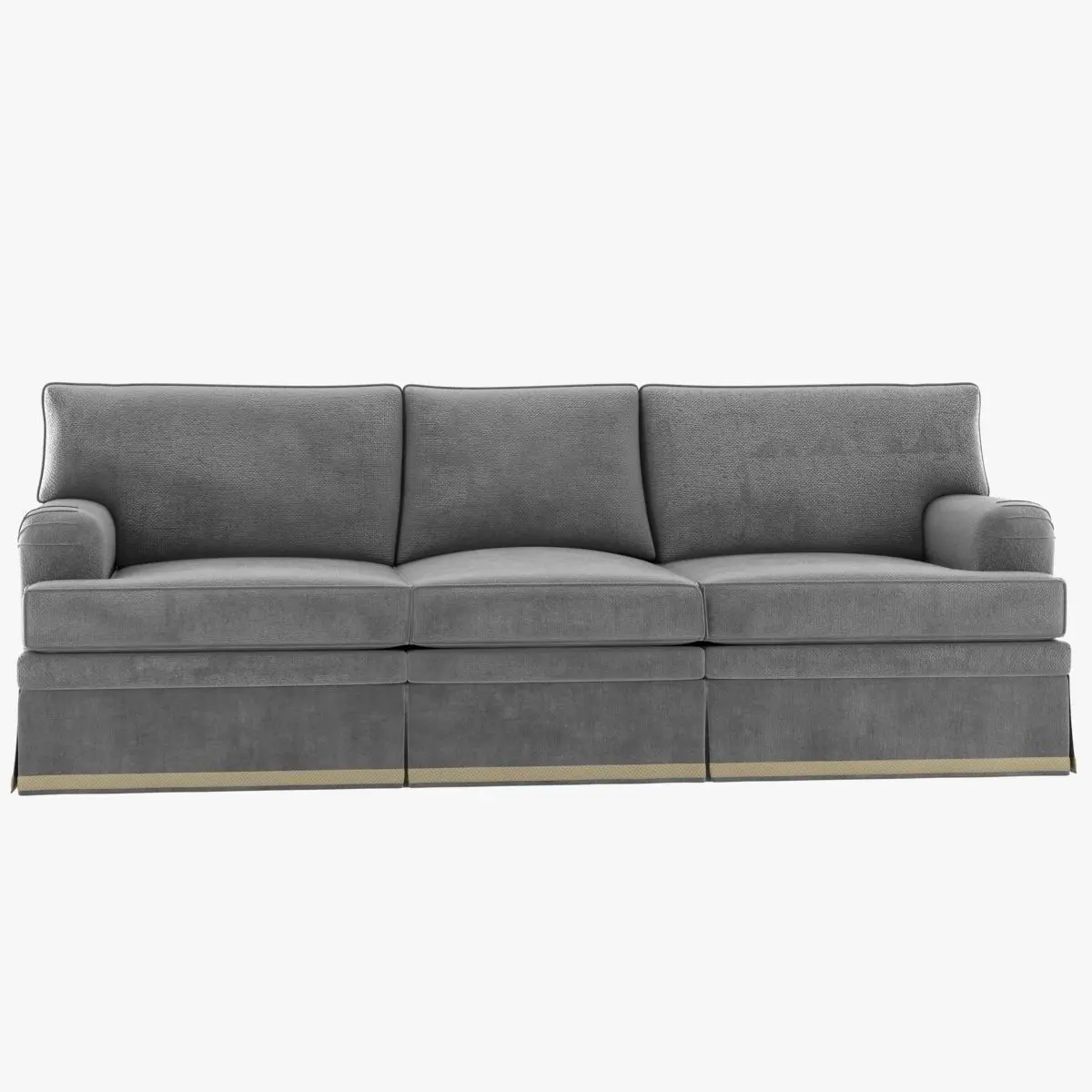 GREATROOM SOFALoose T-shape seat cushions, boxed with self welt. Loose back cushions, knife edge with self welt, 50/50 down and feather fill. Traditional English arm. Tailored skirt from edge roll with pleats at cushion divisions and corners. Standard skirt allowance is ¼”.