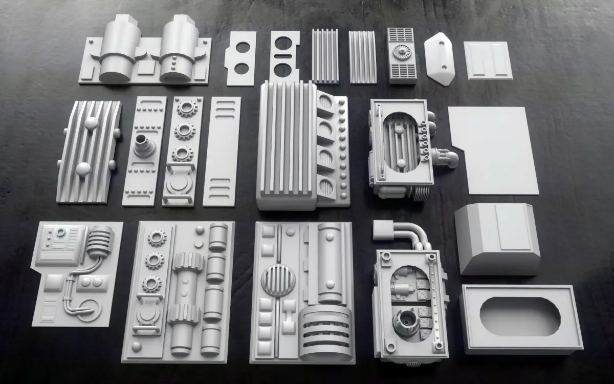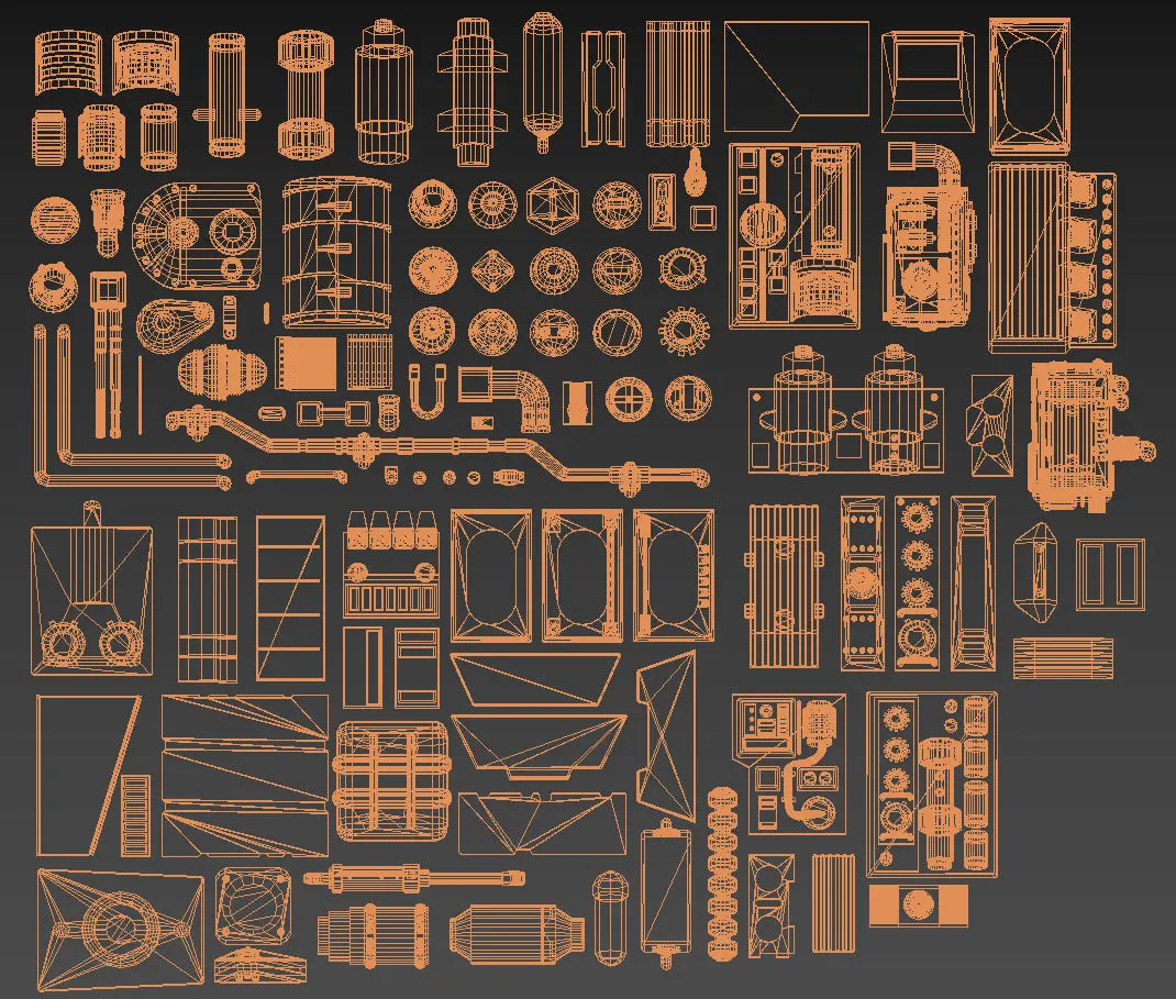 This Greeblie Kitbash Set is a collection of 106 objects, designed to help elevate and expedite building details into sci-fi models. Included are the OBJ files, and two rar files, one with OBJs for each object, and another with an IMM brush for easy use in ZBrush.