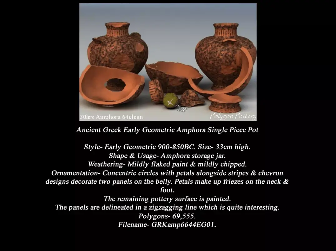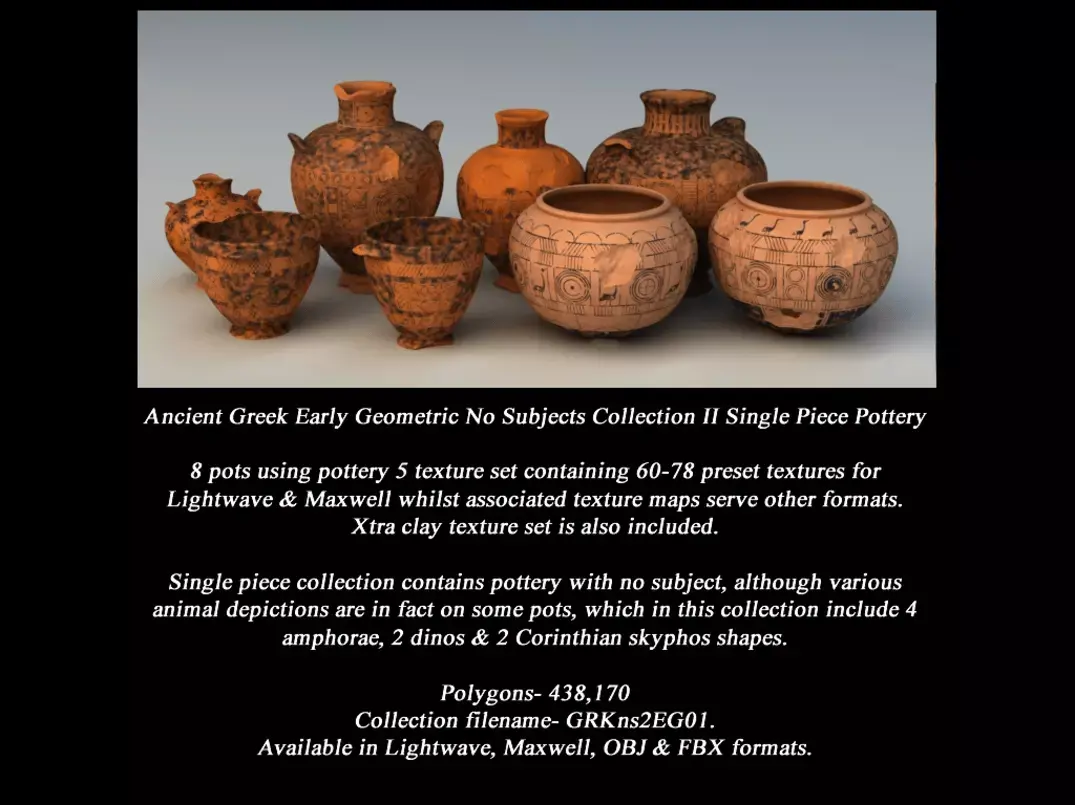 Greek Early Geometric No Subjects Collection II Single Piece Pottery (GRKns2EG01) containing 8 pots using texture set with 6000px by 3000px maps.