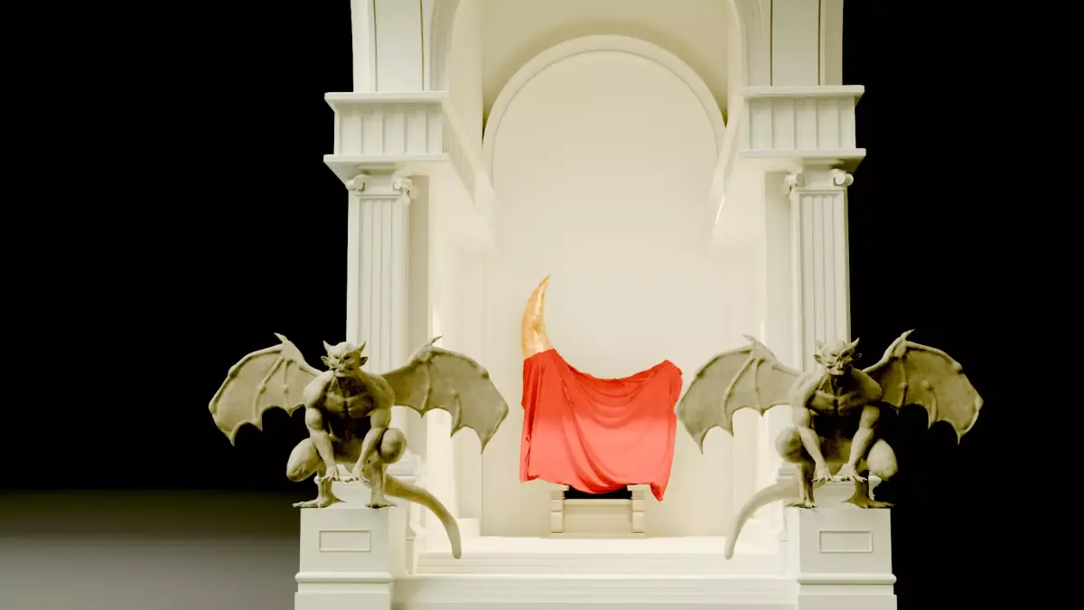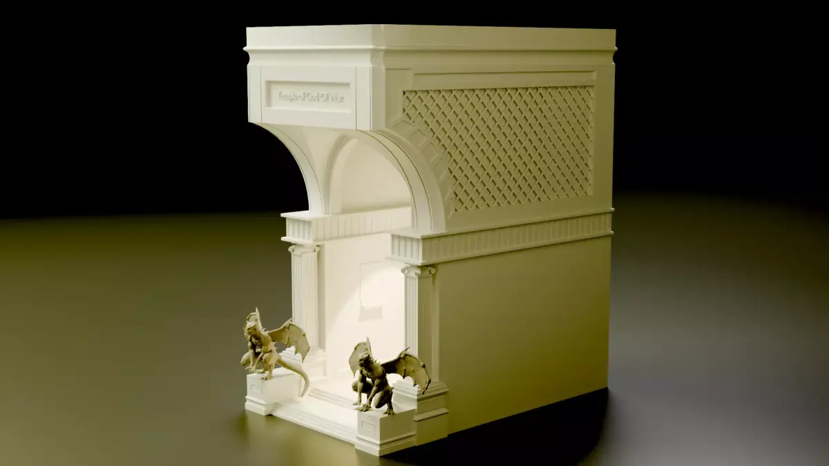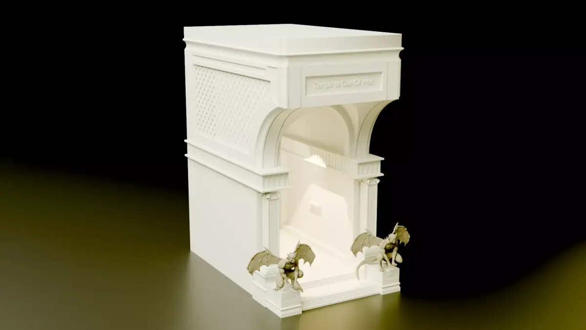 At the heart of the shrine, a throne placed within the inner chamber symbolizes the seat of the war god, subtly illuminated to create a powerful focal point. The recessed design allows light to flow outward in a soft, controlled glow, emphasizing the depth of the arch and the sculptural detailing. The symmetrical guardian figures at the base reinforce the theme of protection, dominance, and mythological grandeur.