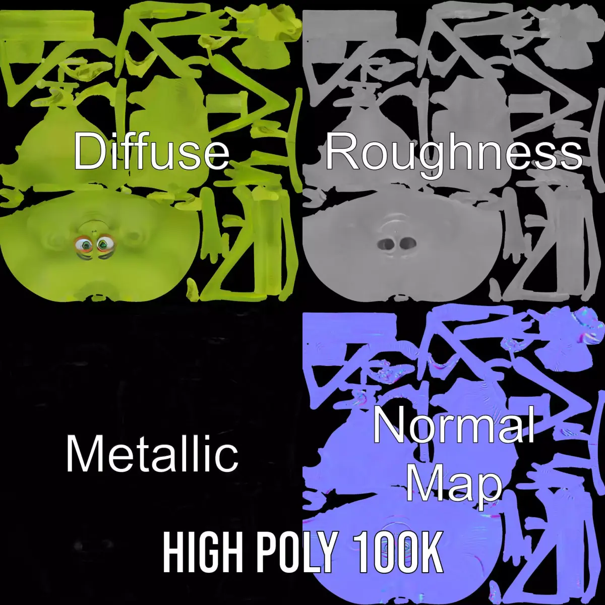 This Green Alien Character model pack is perfect for sci-fi and fantasy projects. With its vibrant color and unique design, it can be used in games, animations, and virtual reality settings. Each model has 3 levels of detail: low-poly (1000 triangles for mobile), middle-poly (10,000 triangles for environment), and high-poly (100,000 triangles), allowing for use in production rendering (such as 3ds Max, Maya, Cinema 4D, Blender, Vray/Corona/Cycles, and all others), game engines (Unity and Unreal compatible), and interactive presentations, providing a choice of detail based on the LOD System principle. The model's textures include PBR, Diffuse, NormalMap, and reflection/roughness/metallic, suitable for any modern rendering engine. Each model is accurately unwrapped with no overlapping UVs. Textures are 4096*4096 in size. If you enjoyed this model, please like and leave a comment!