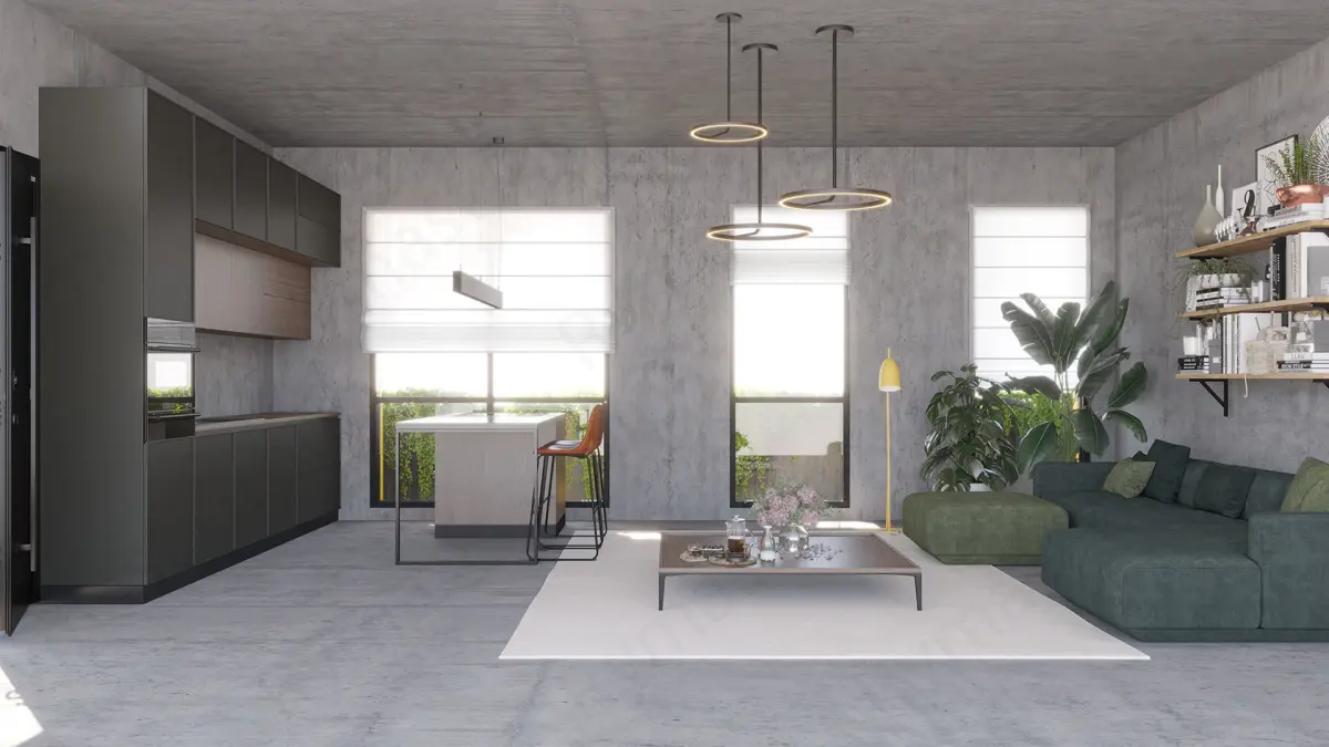 The model features both external and internal architectural elements, including detailed layouts, exterior scene, interior furnishings, landscaping, and lighting setups. It integrates green building components such as solar panels and advanced utility systems, ensuring an authentic representation of modern sustainable practices.
