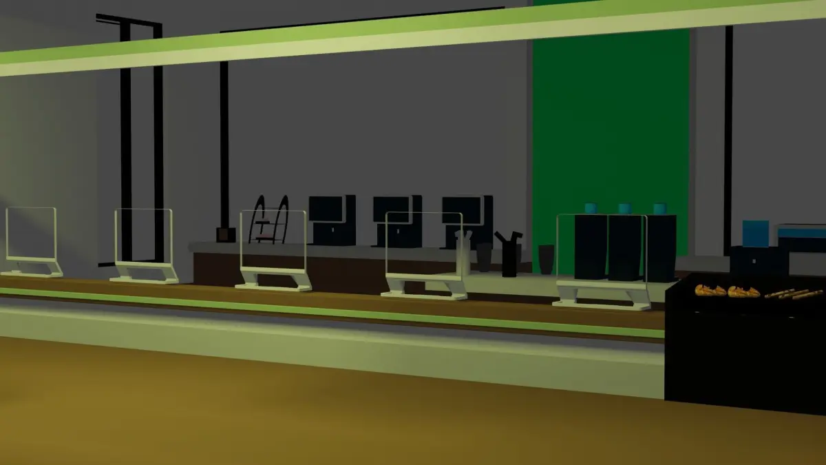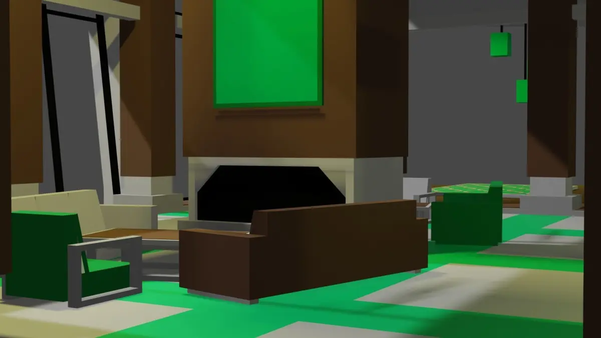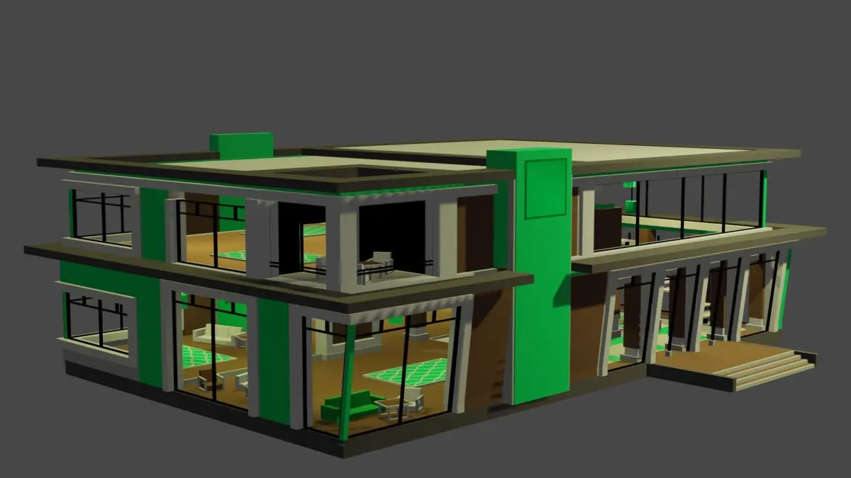 THis is a 2 story cafe with a light green trim. It has matching furniture through out the cafe. This model has 281,067 Vertices.