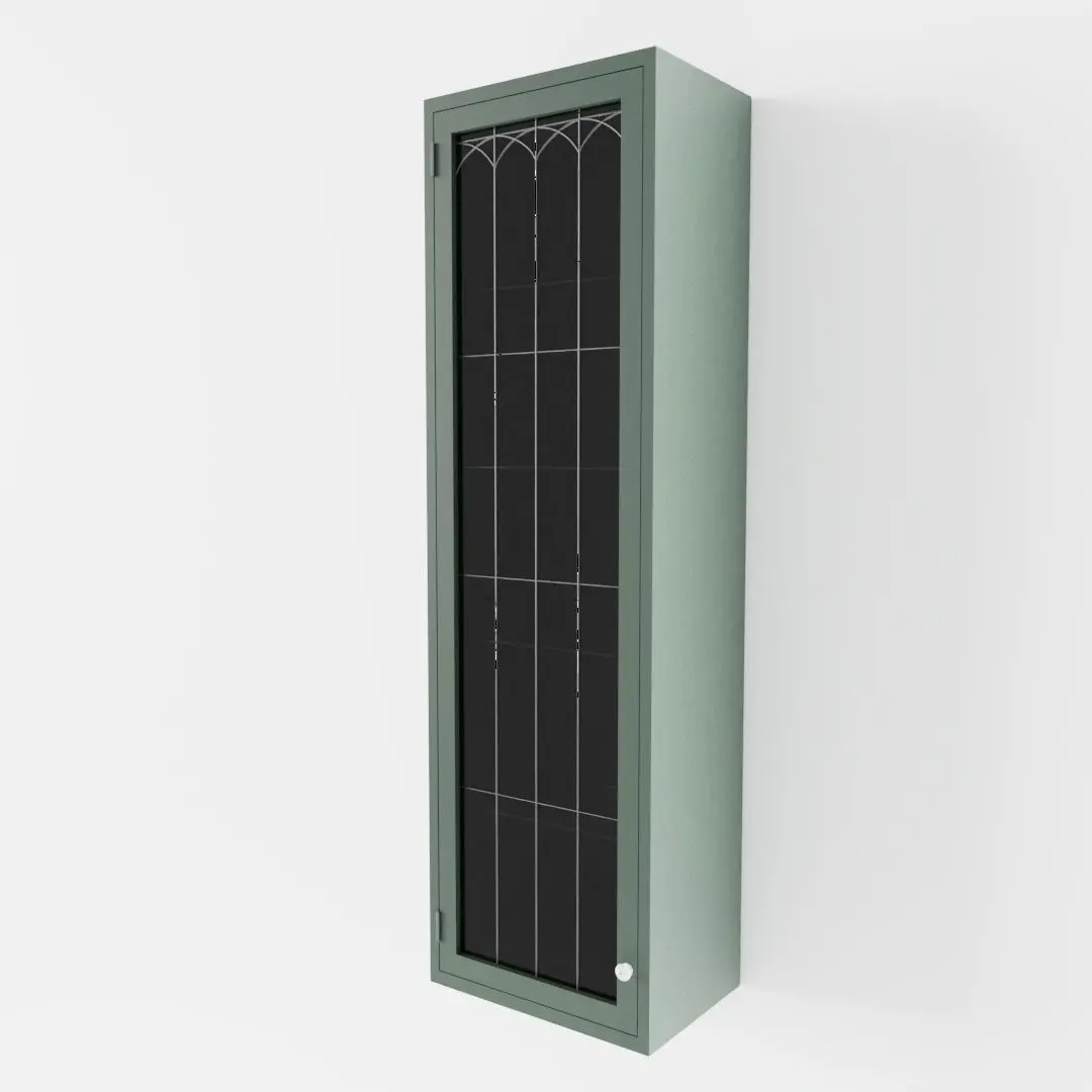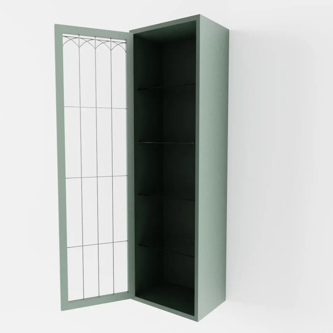 The model has real world scale and measures approximately 31 cm in depth, 44 cm in length and 150 cm in height. It consists of two seperate, but grouped and parented meshes: Green Cottage Kitchen Wall Cabinet and Door. Exception: in the .ply-file they are joined together.