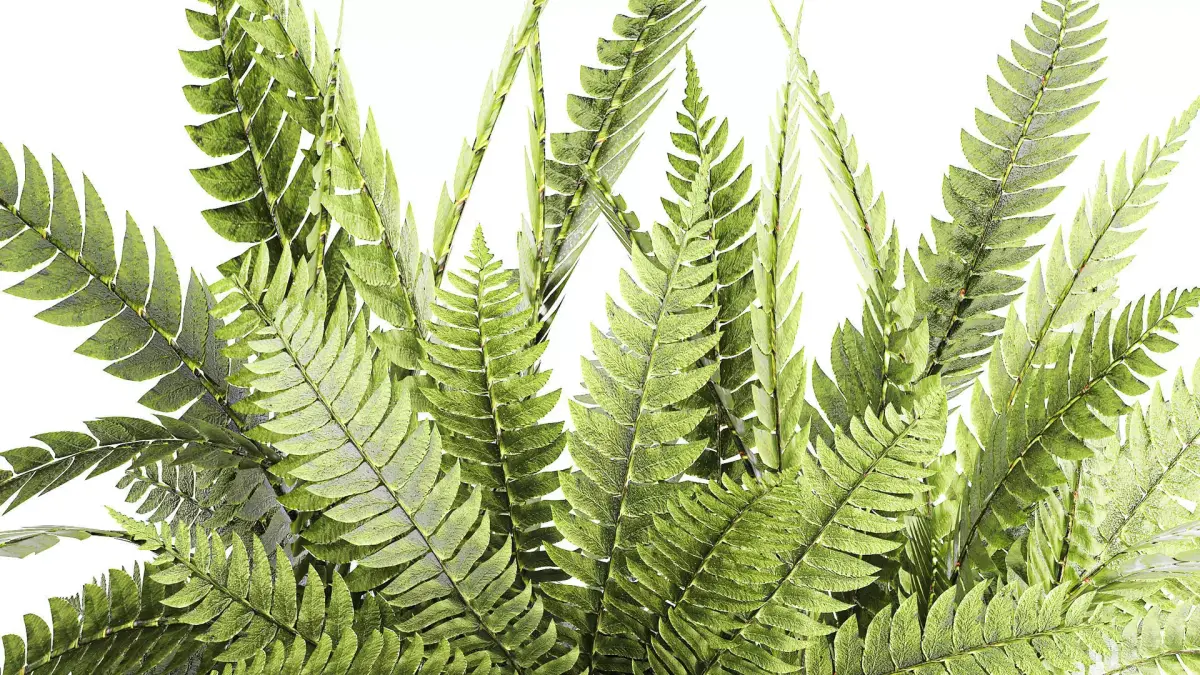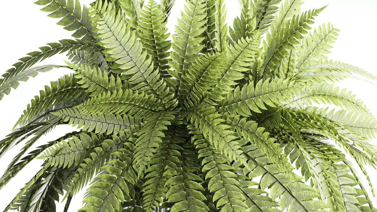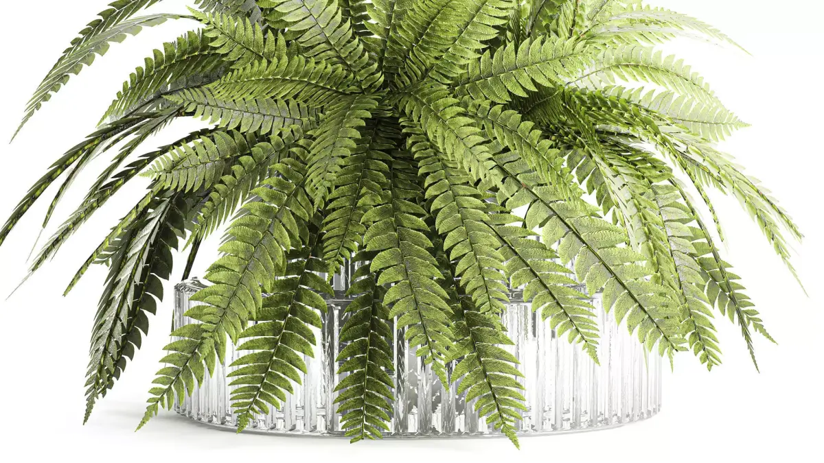 Stylish green floral bouquet of fern branches in a modern glass vase. Set 651.Bouquet of branches and green flowersStylish modern realistic bouquet of asparagusvasenephrolepis, fern - fern
