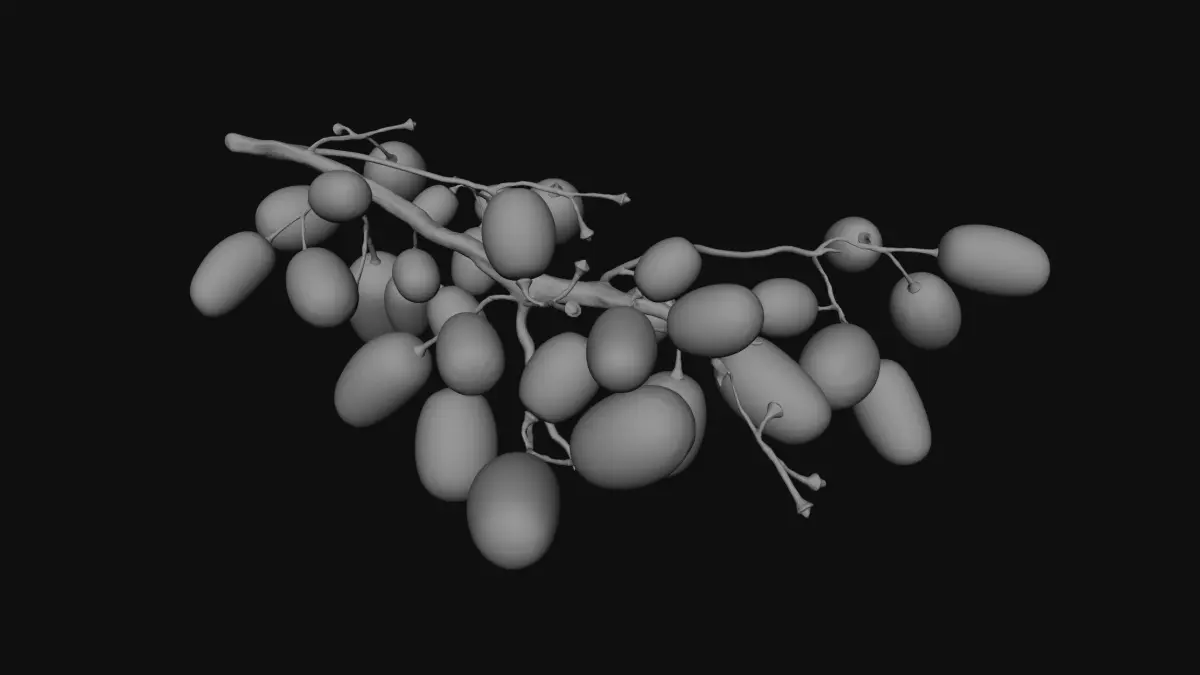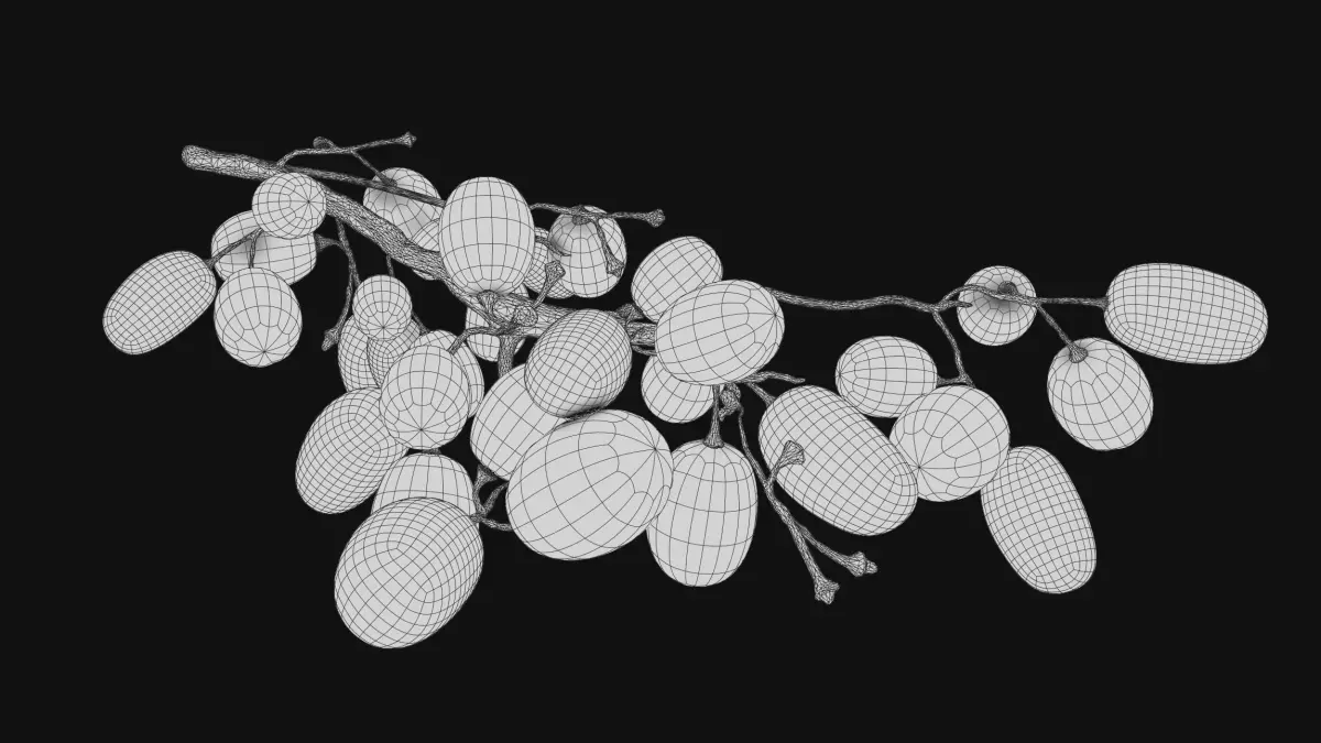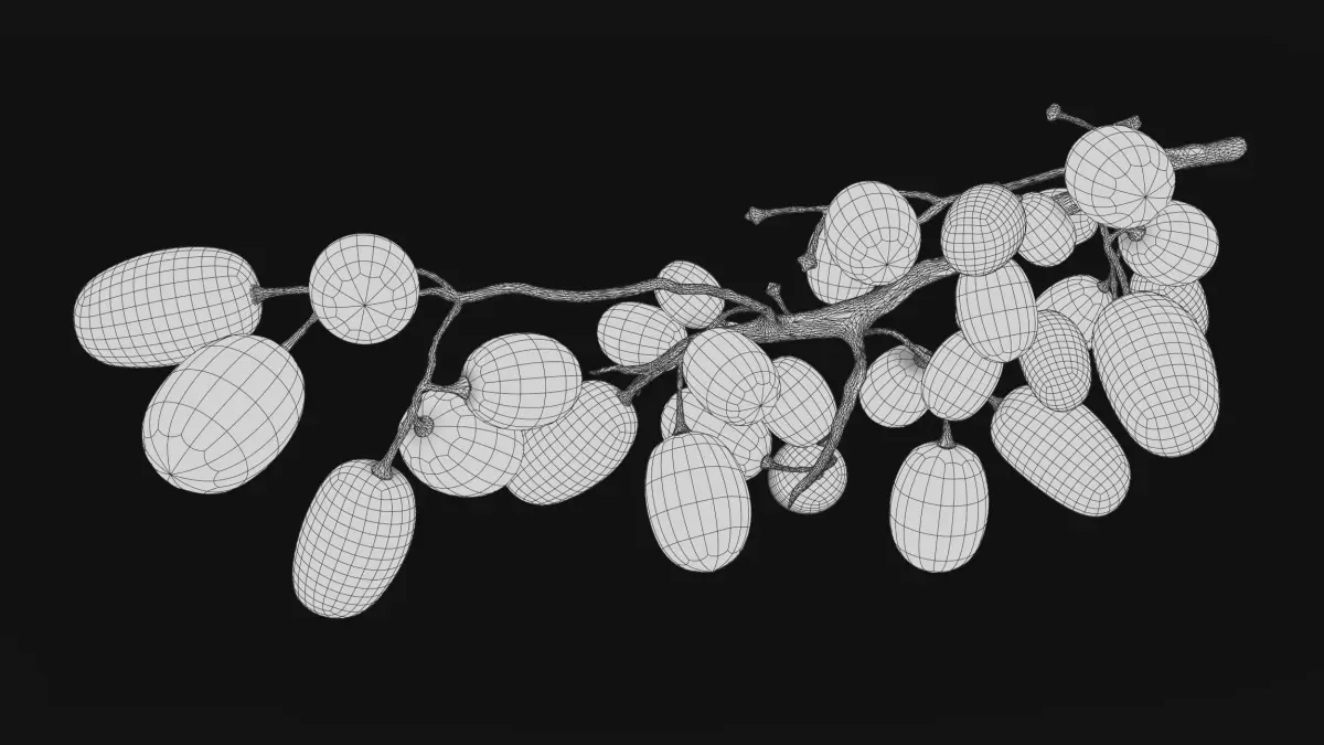 Model of twig with grapes. Texture maps (Diffuse, Specular, Glossy, Translucency Color, Translucency Mask and Height). The model was originally created in Maya 2016. All the fruit geometry is smooth-able.