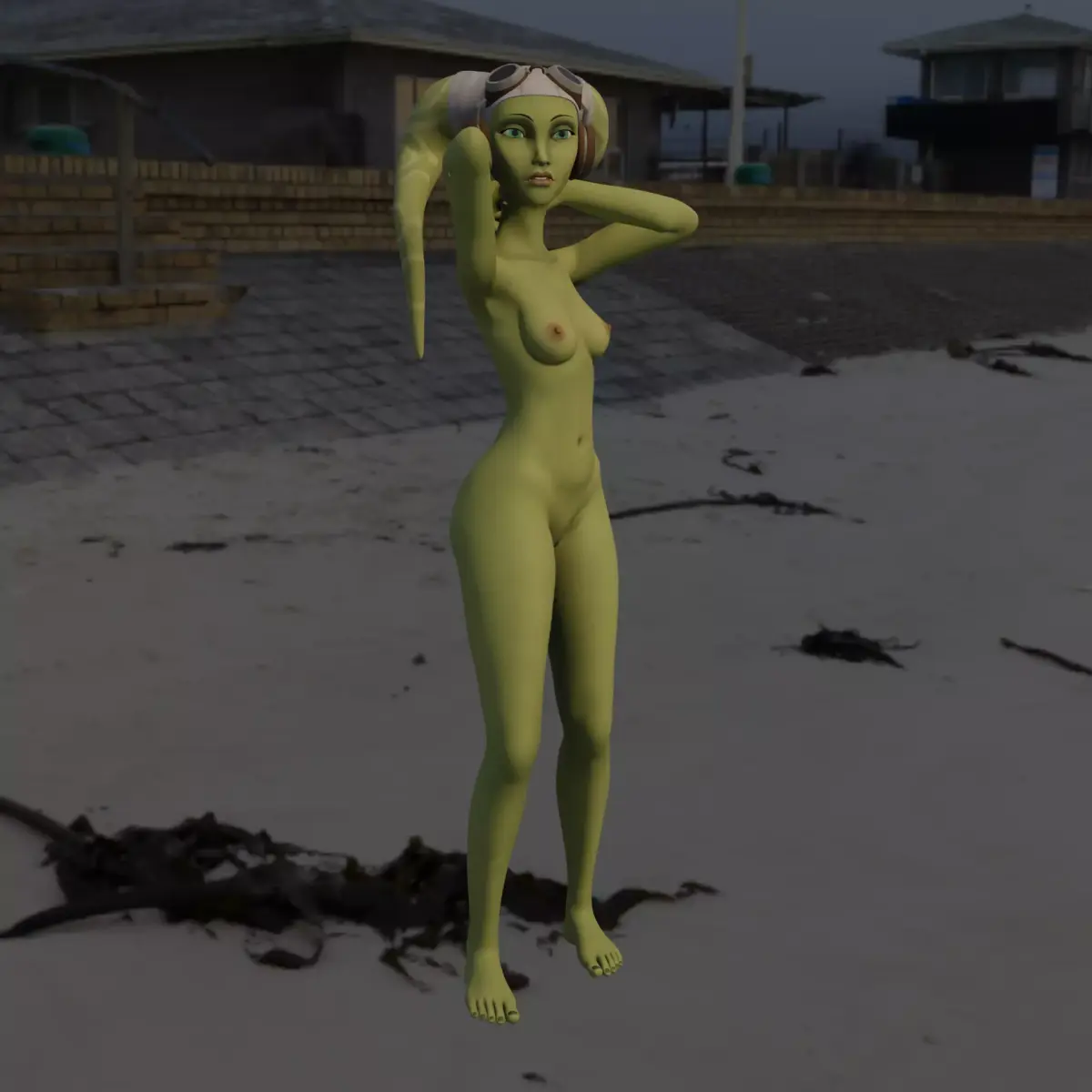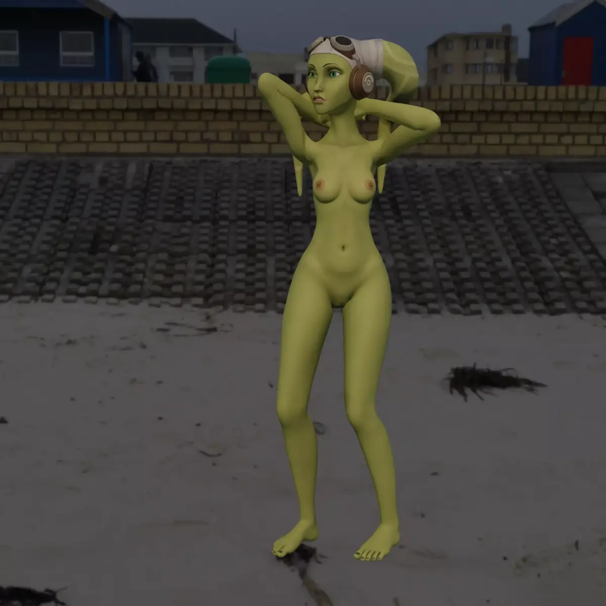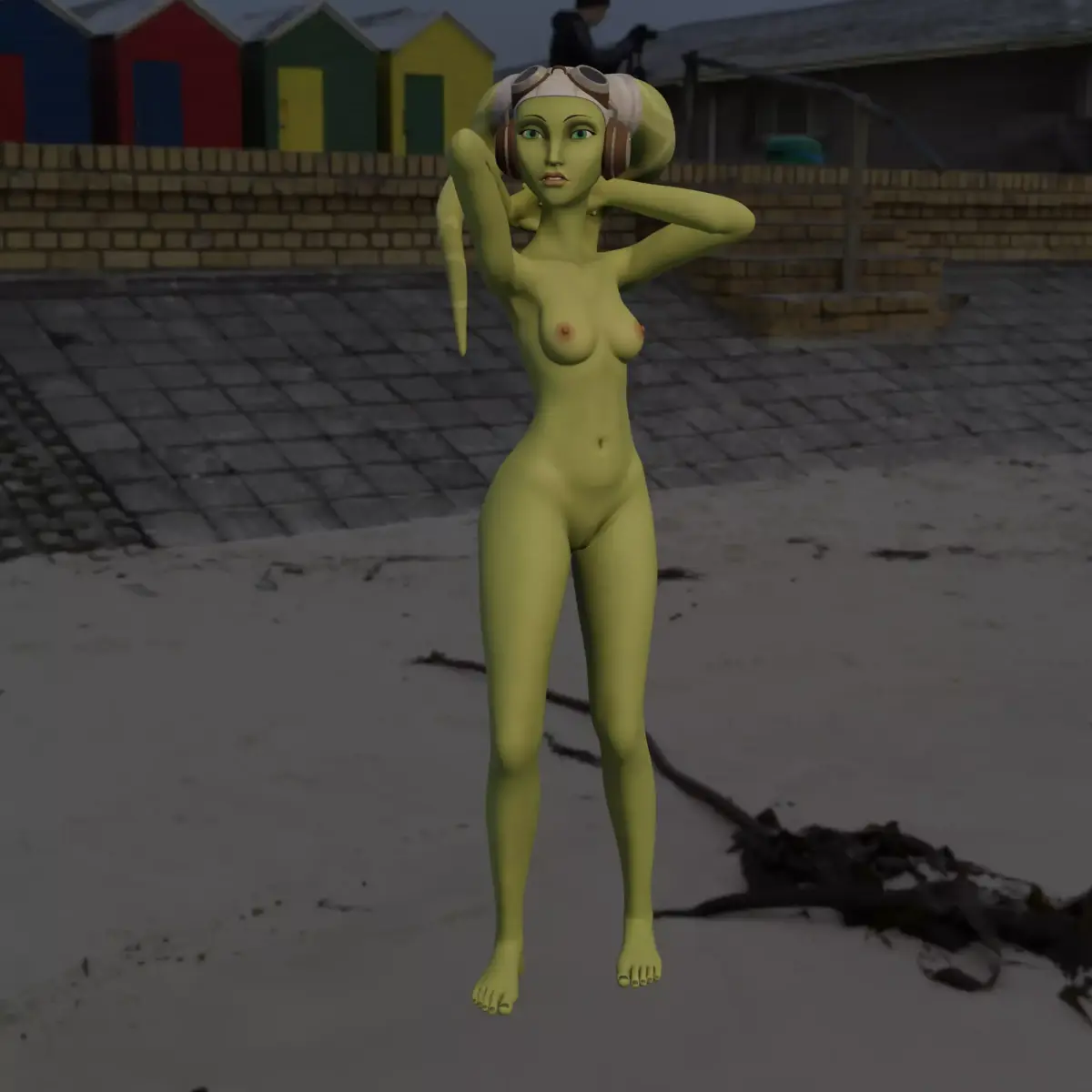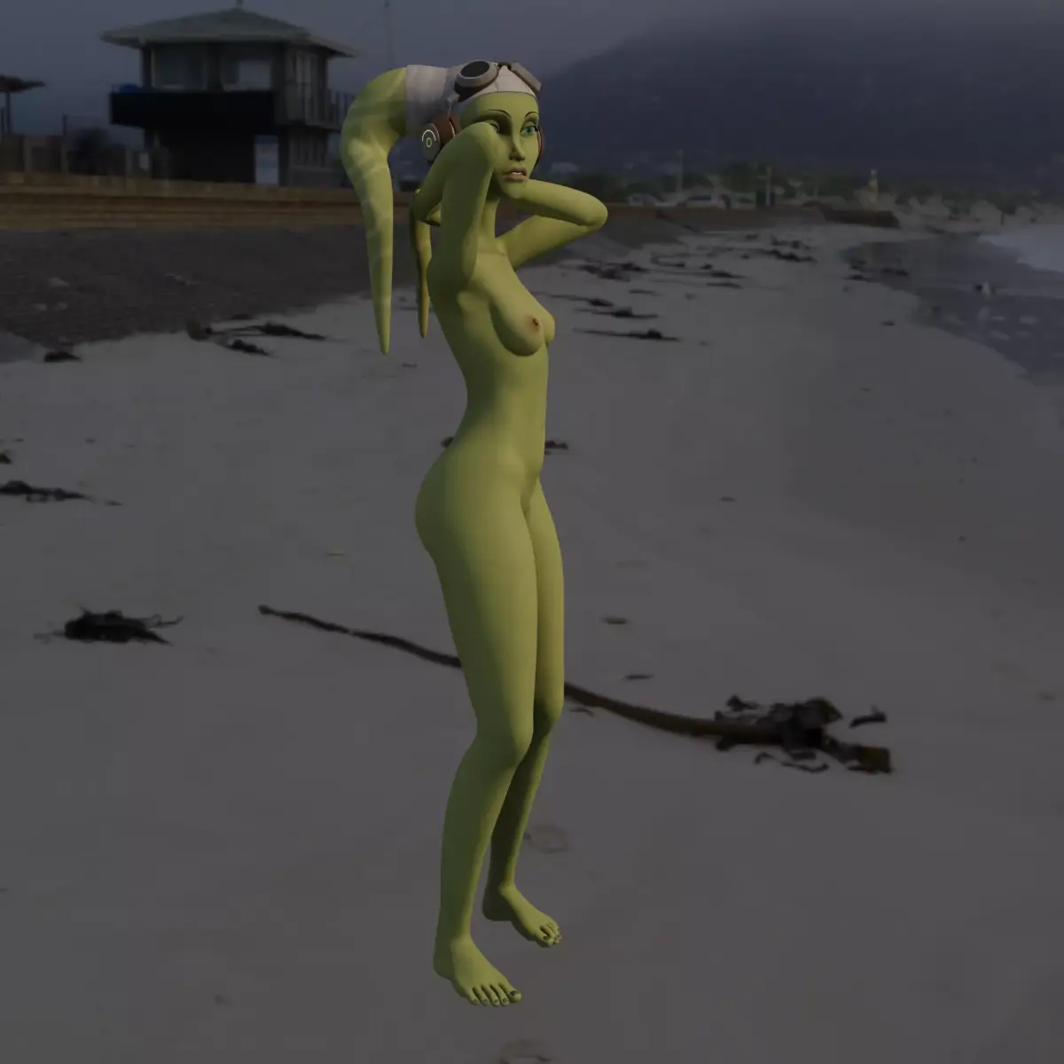 A stylized 3D model of a humanoid alien female with green skin and twin head-tails, wearing pilot-style goggles. She has a graceful, athletic build and an elegant sci-fi explorer vibe. Perfect for sci-fi or fantasy art projects, collectibles, or game characters.