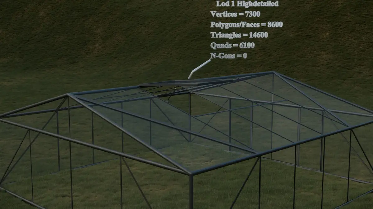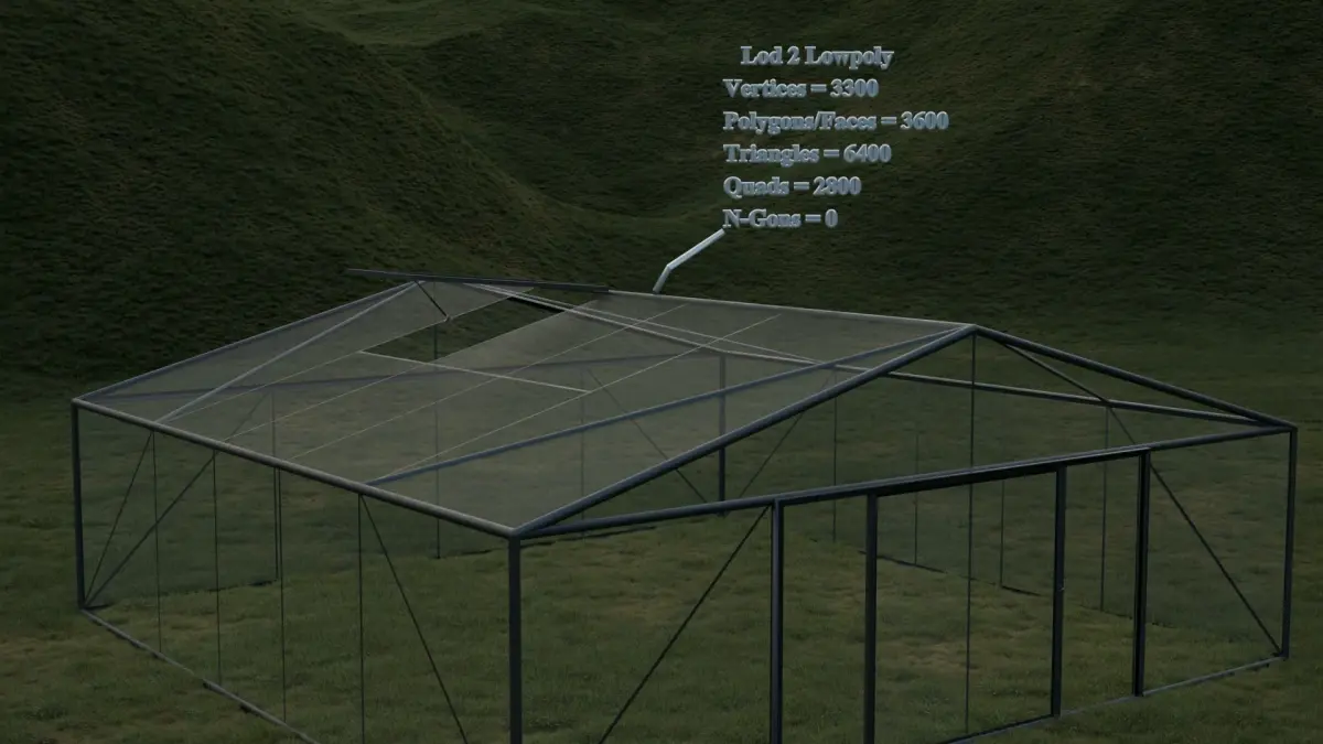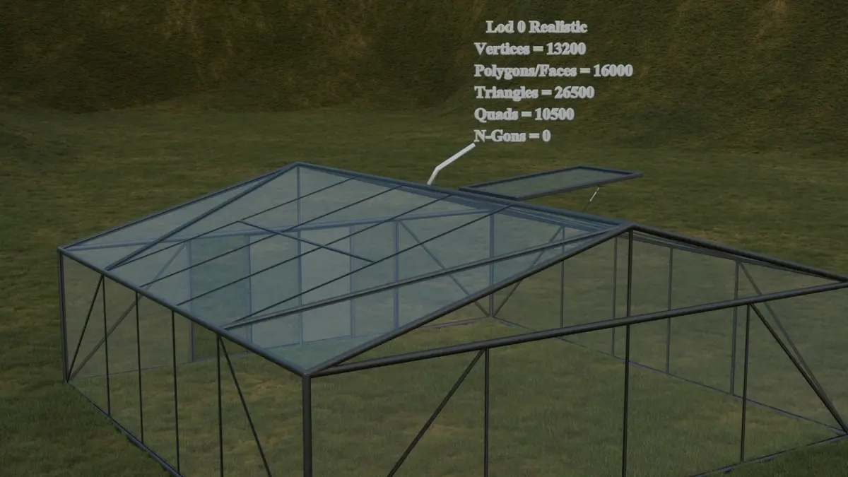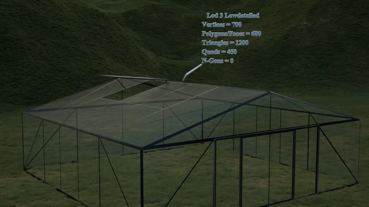 The greenhouse model is available with Realistic(Lod0), High Detailed(Lod1), Low Poly(Lod2), Low Detailed(Lod3) options.