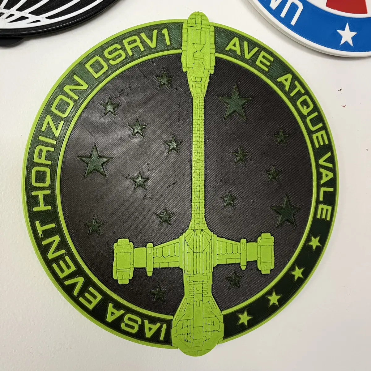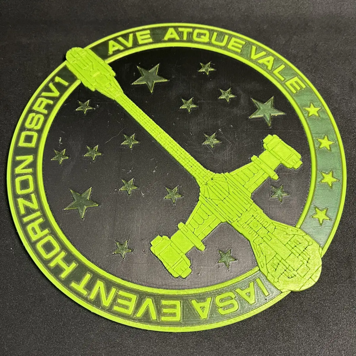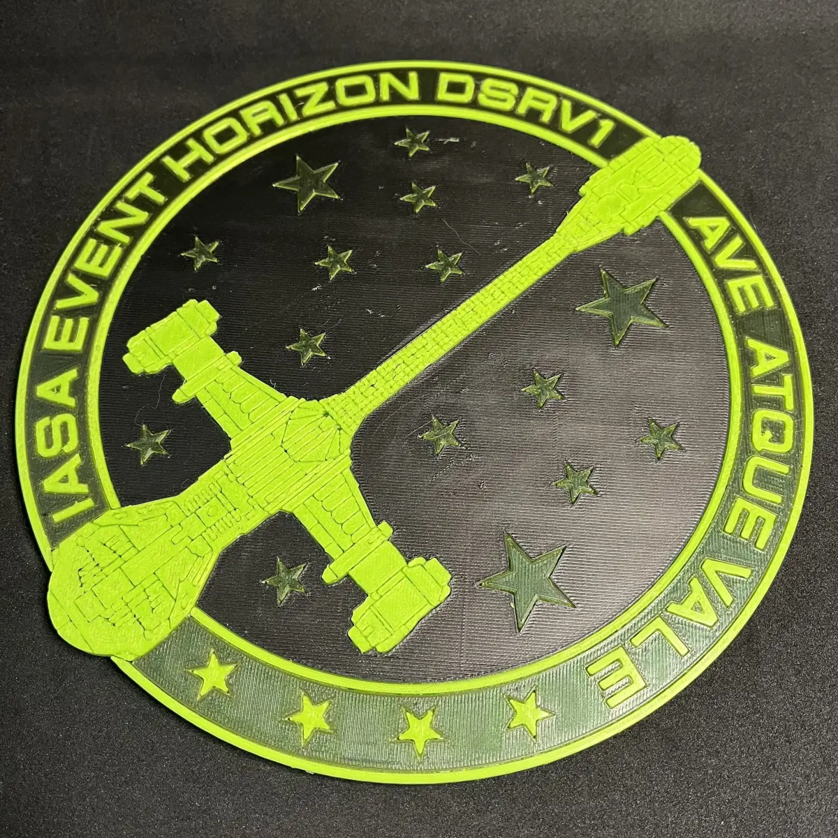 This plaque is my take on a possible ship's plaque for the IASA Event Horizon, from the classic sci-fi horror movie of the same name. If you haven't seen it I very much recommend checking it out, just... keep a cushion handy if you're squeamish; you may need to cover your eyes a few times...