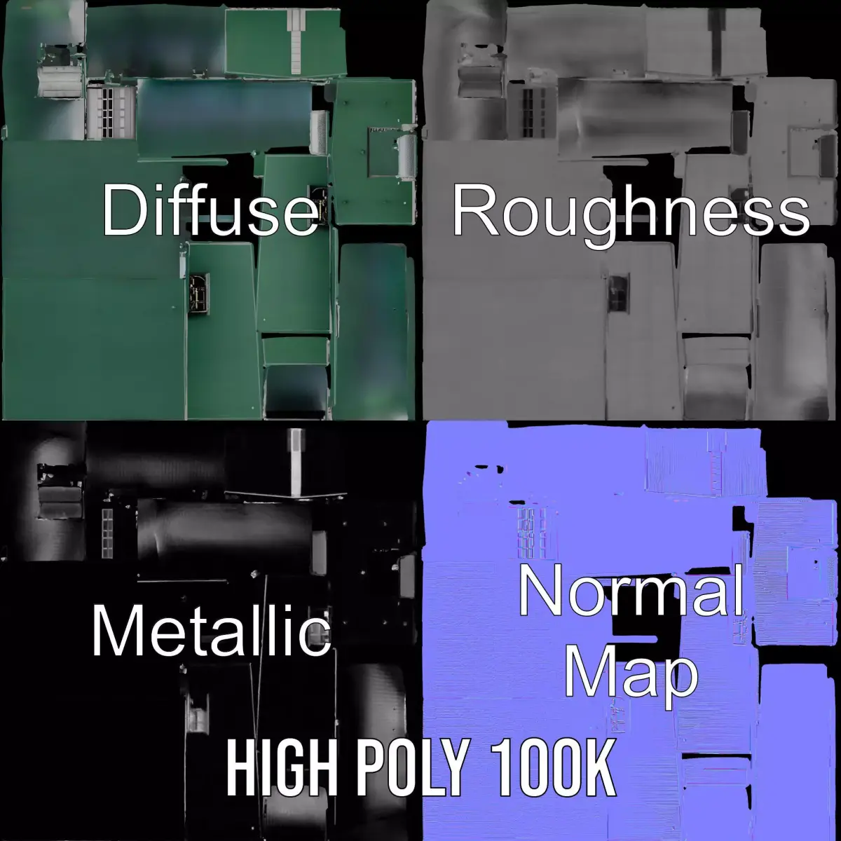 This industrial warehouse 3D model features a modern green exterior, perfect for diverse virtual environments. Each model has 3 levels of detail: low-poly (1000 triangles for mobile), middle-poly (10,000 triangles for environment), and high-poly (100,000 triangles), which allows for the use of this model in production rendering (such as 3ds Max, Maya, Cinema4D, Blender, Vray/Corona/Cycles, and all other), game engines (Unity and Unreal compatible), and interactive presentations, providing a choice of detail based on the LOD System principle. This model is ideal for architectural visualizations, simulation environments, or as a background element in industrial-themed games. Its textures are PBR, Diffuse, NormalMap, and reflection/roughness/metallic, suitable for any modern rendering engine. All models are accurately unwrapped and have no overlapping UV. All textures are 4096*4096 in size. Please like and leave a comment for the model if you enjoyed it.