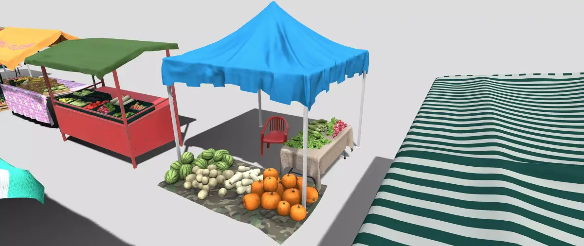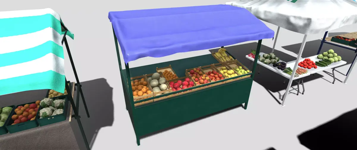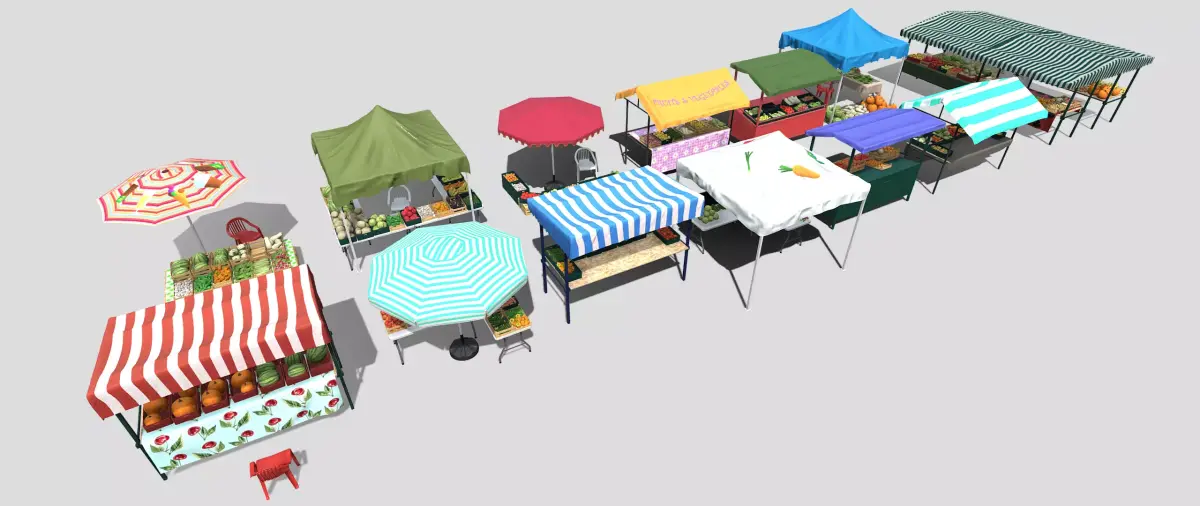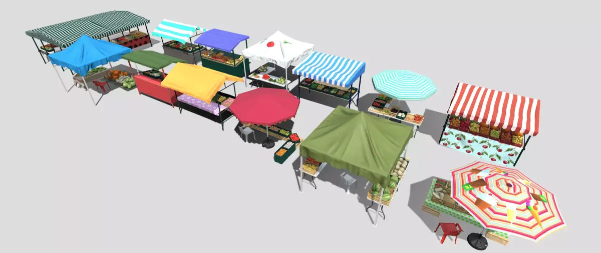 13 green market stalls. There is 12 of single market stalls and one stall with four stands. All 13 stalls are in separate files , so you can choose if you want all of them in your project or some of them. Most of polygons are quads.