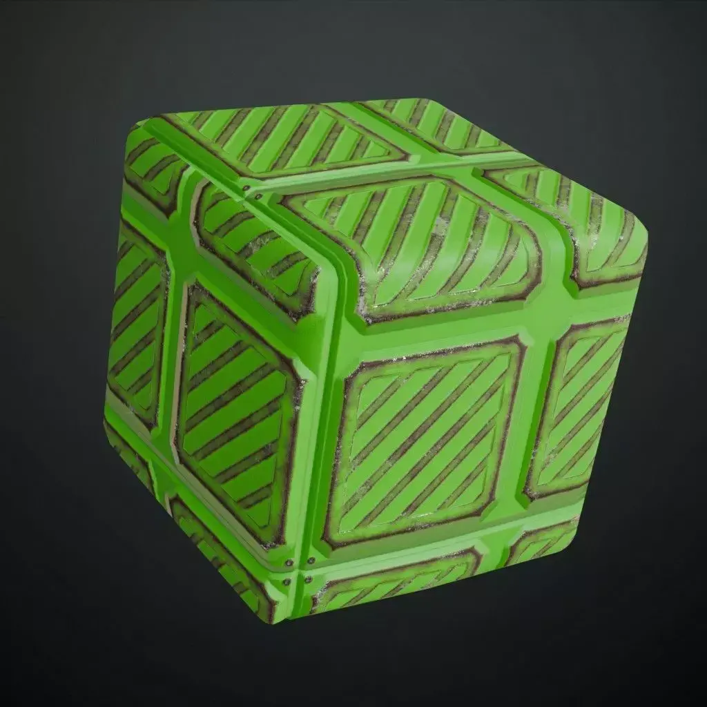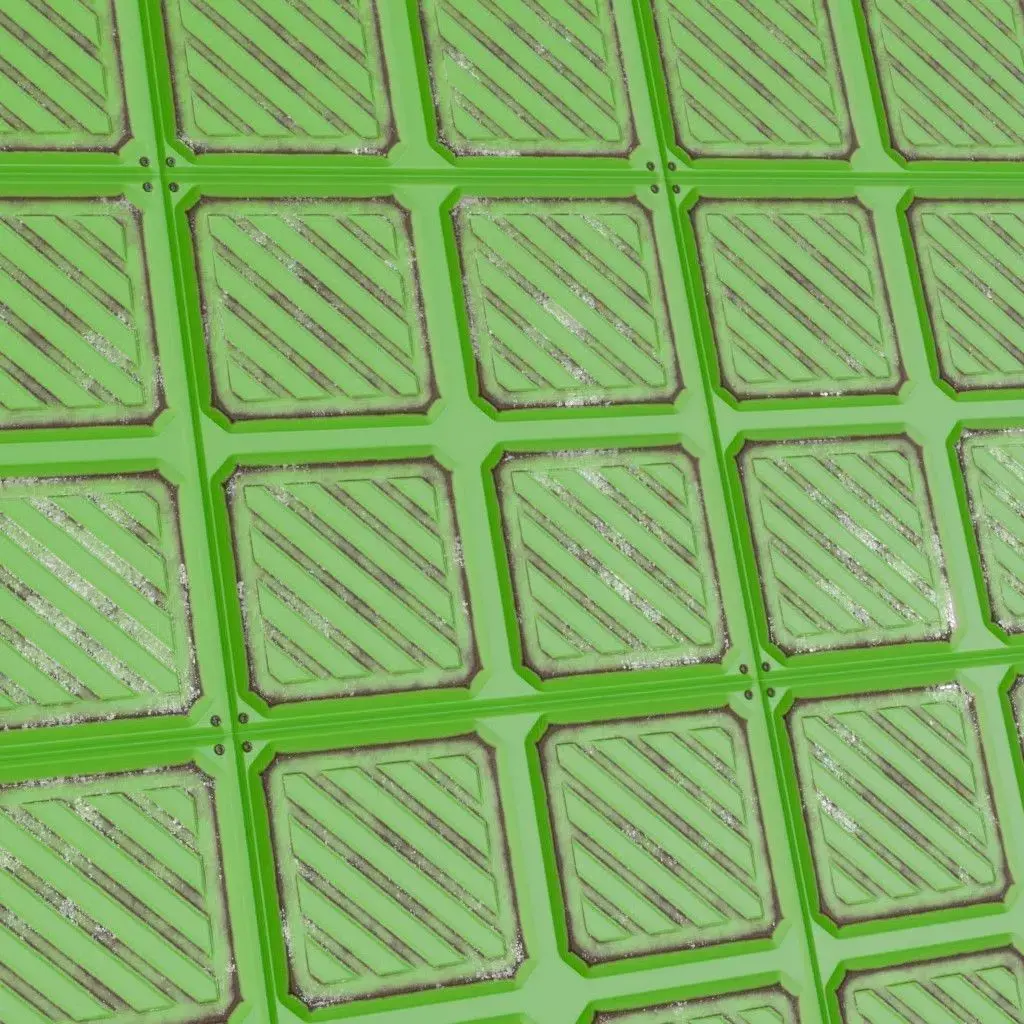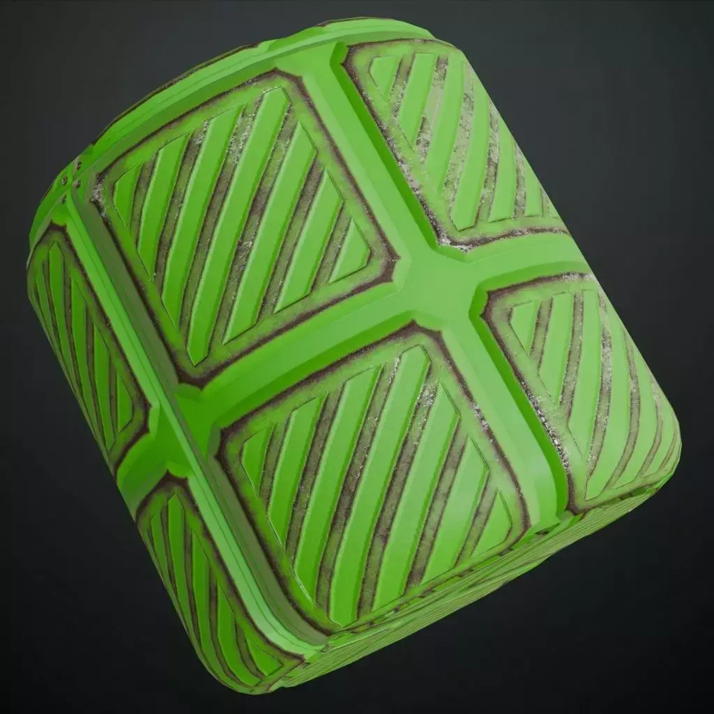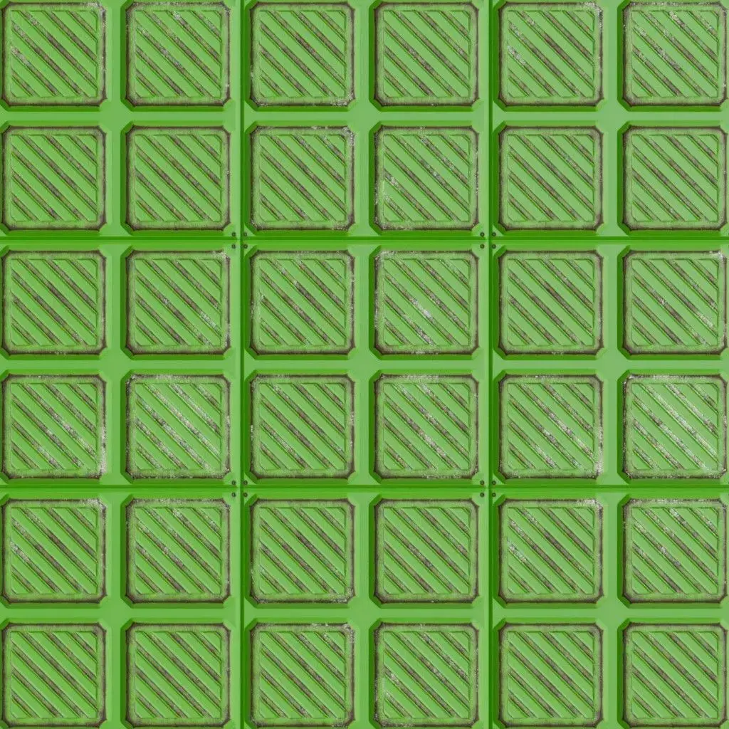 This is a high-quality PBR Texture Pack of a Green Metal Plate Sci-Fi surface.All essential Maps, including BaseColor, Normal, Roughness, Height, and Metallic, are provided to deliver a highly realistic and technologically advanced finish. This material features a sophisticated array of paneling, consisting of a structured grid of embossed square sections, each featuring recessed diagonal warning stripes and precise industrial grooves. The vibrant green metallic paint is accented with realistic edge wear and surface grime, making it an ideal choice for futuristic military installations, high-tech factory floors, sci-fi cargo holds, or specialized environment assets.