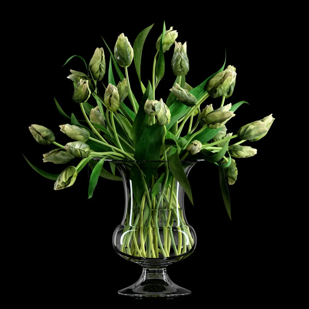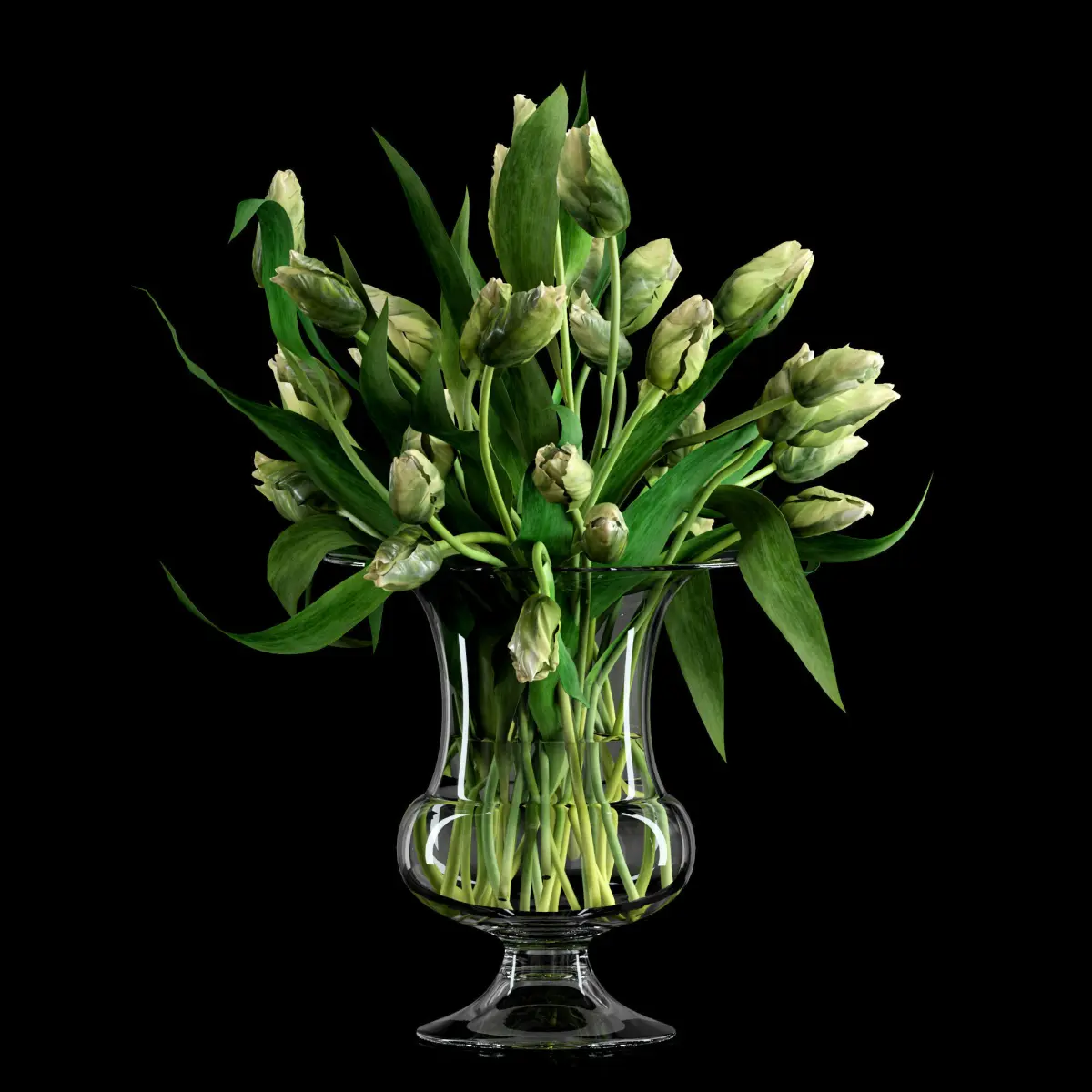 File includes very realistic Green Parrot Tulips in glass vase. Native format is 3dsmax 2014. Vase&water is covered by Turbosmooth with 2 itterations.