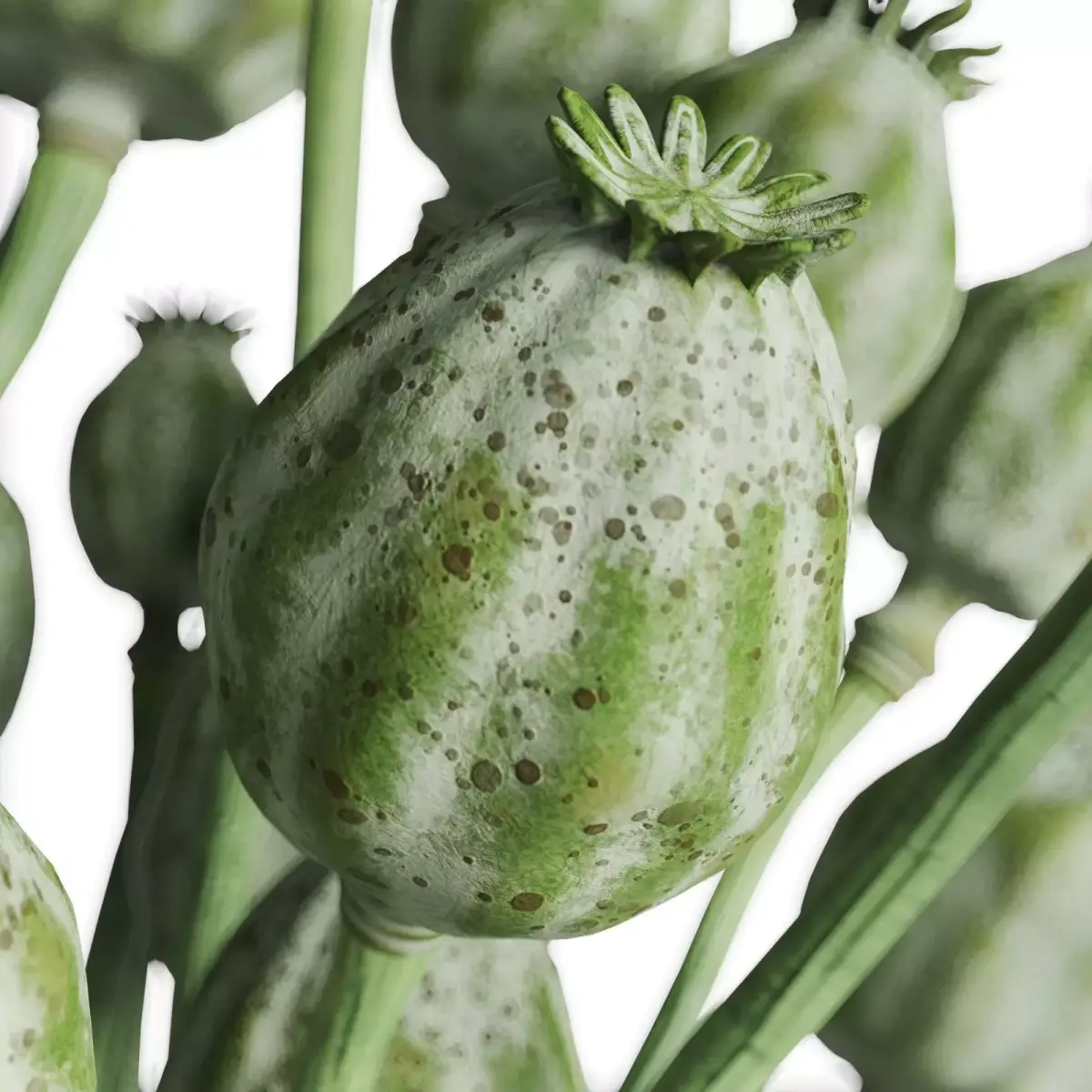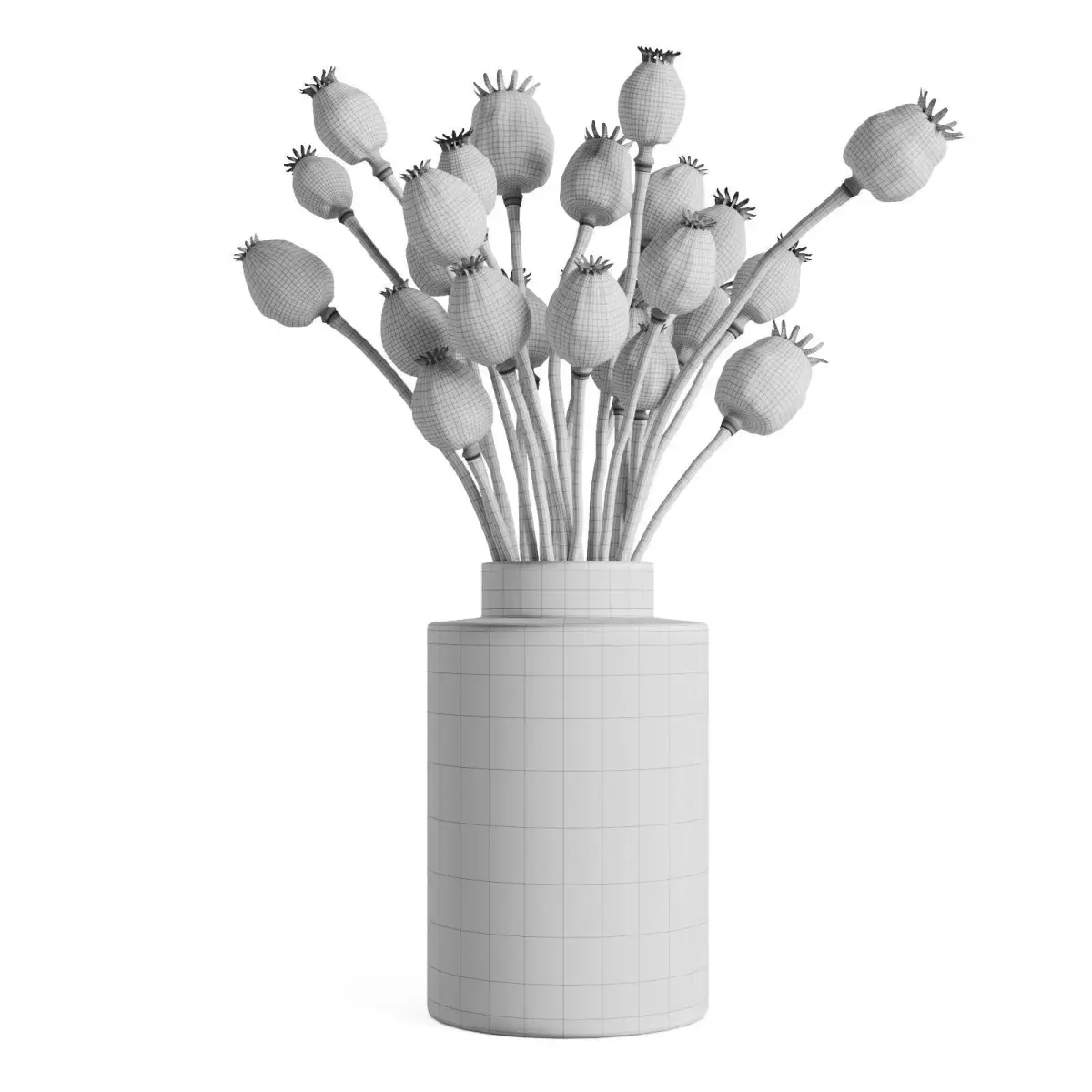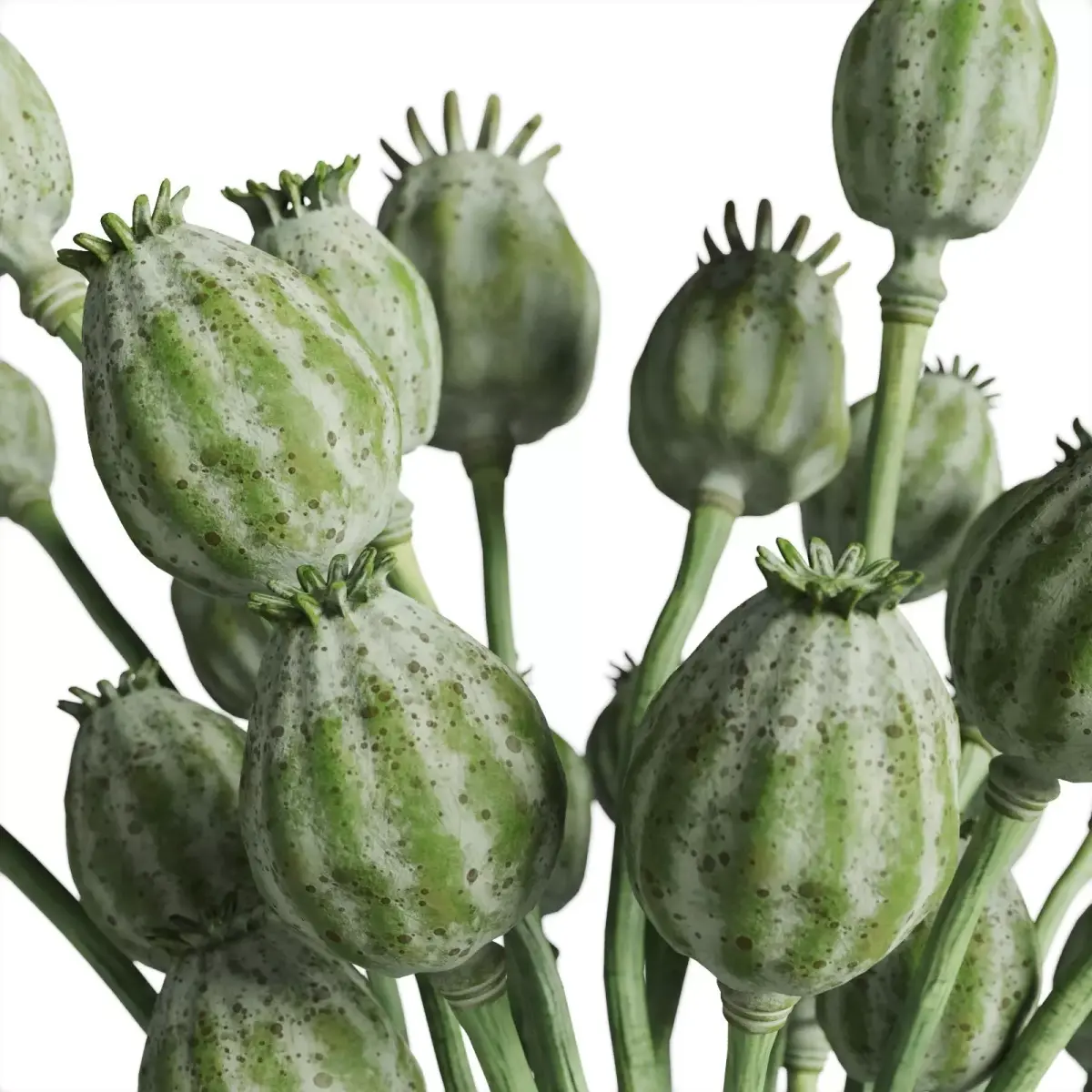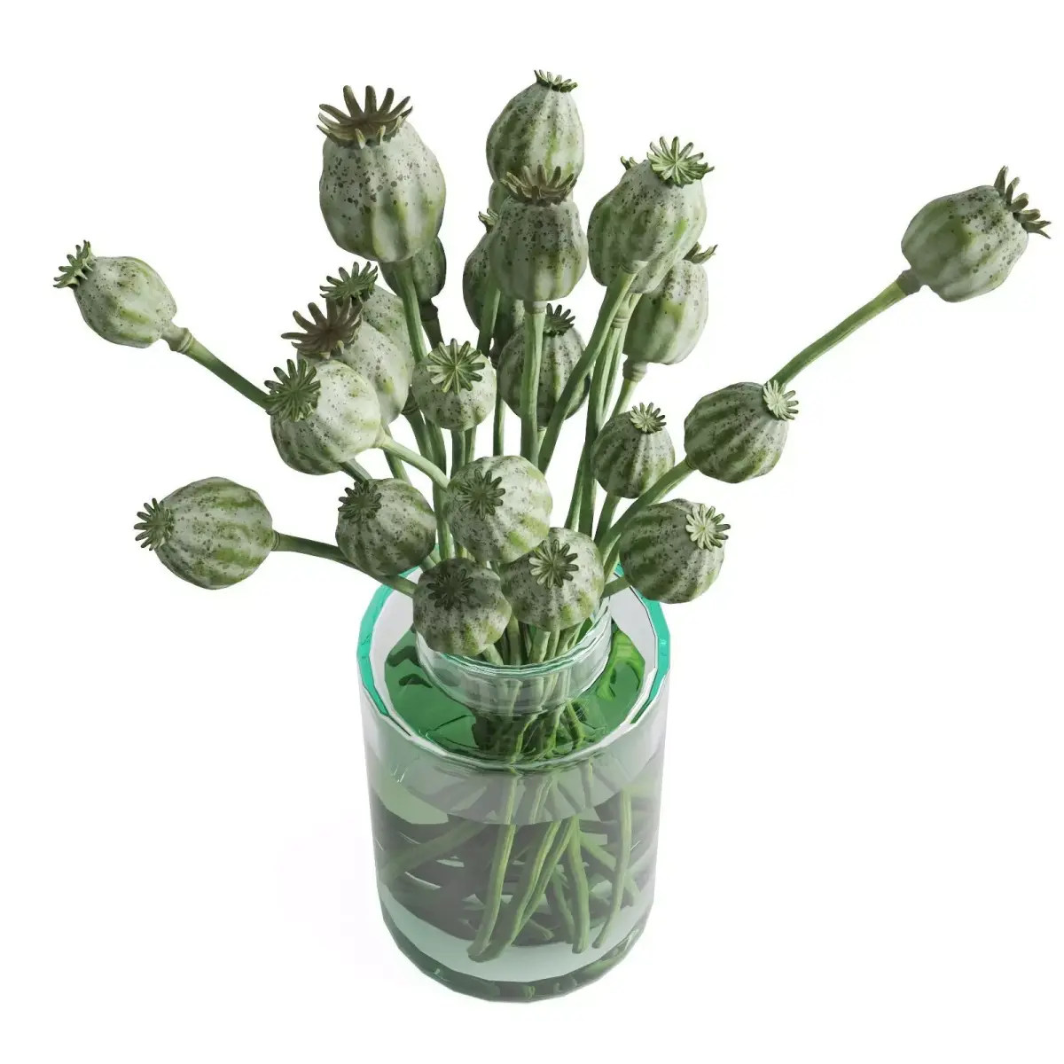 A detailed 3D model of green poppy seed heads (Papaver somniferum) arranged in a transparent glass vase with water.The model accurately represents the natural texture, color variation, and organic imperfections of real poppy pods. Ideal for interior renders, botanical scenes, still life, or minimalistic decoration projects.