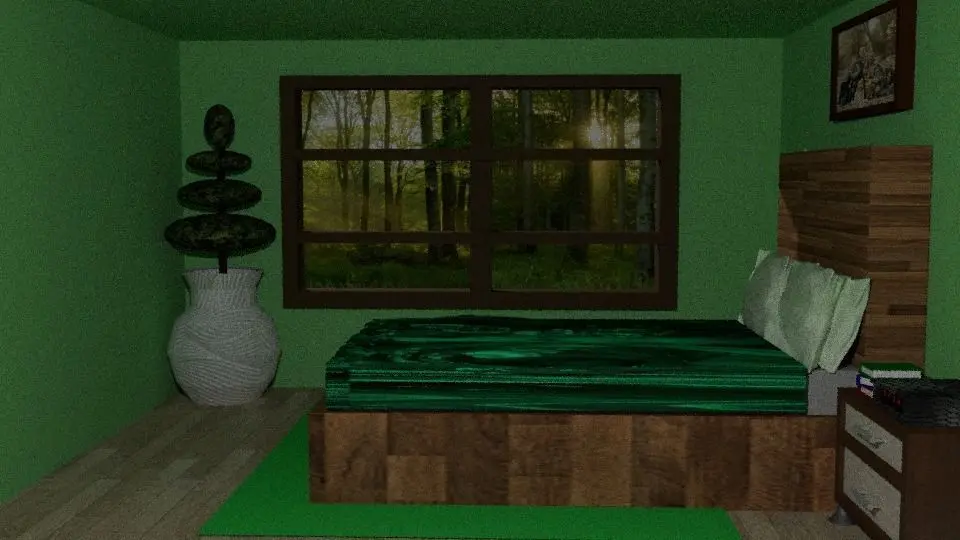 Green room. Includes uniform furniture. Bed, bedside table, books, tree, digital clock.The view through the window was beautiful, and the infiltrating rays of the sun created beautiful shadows.
