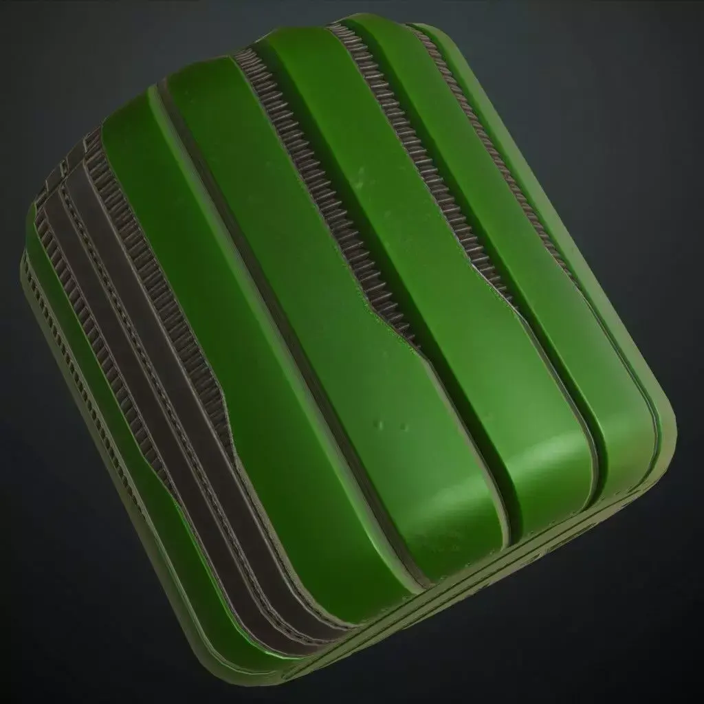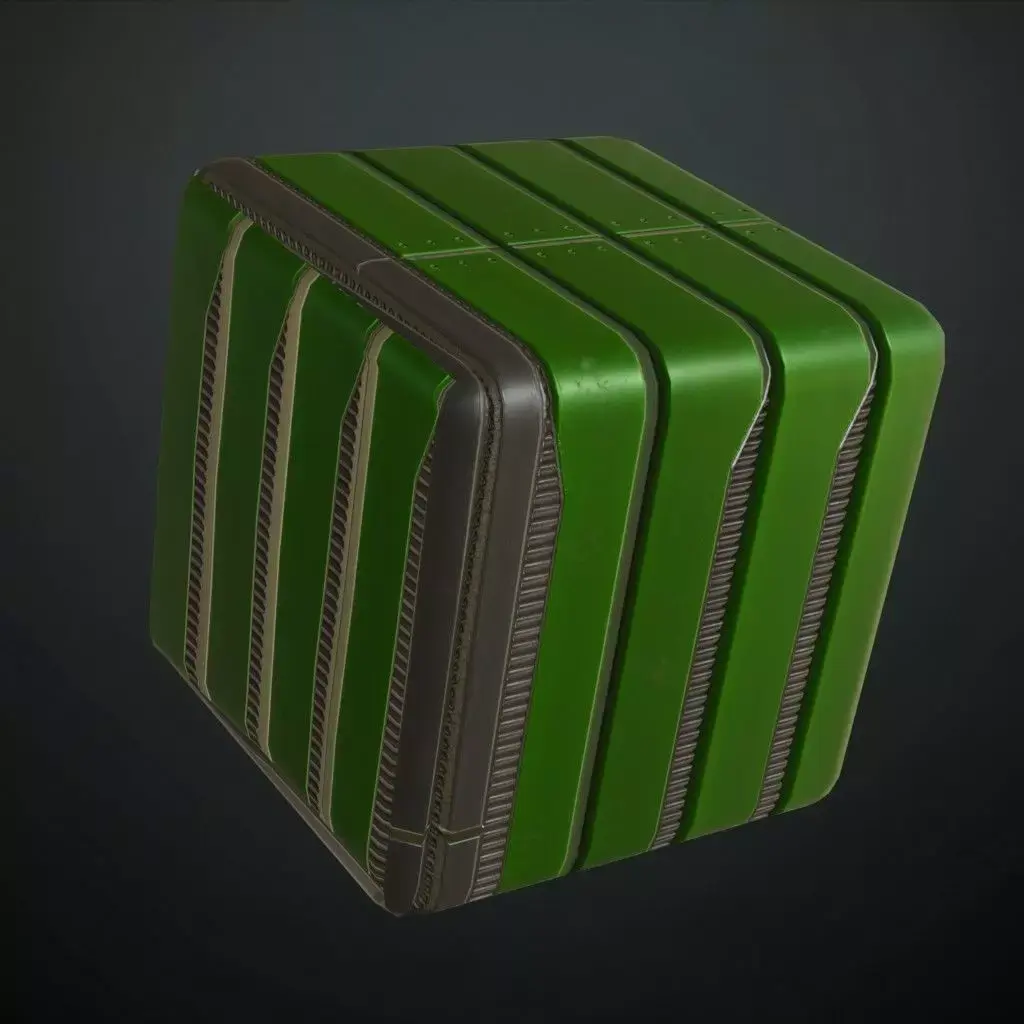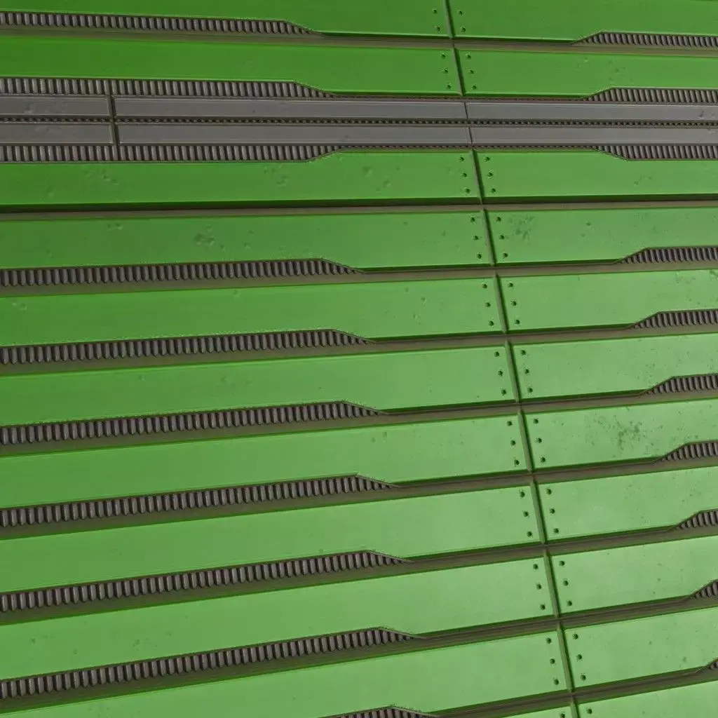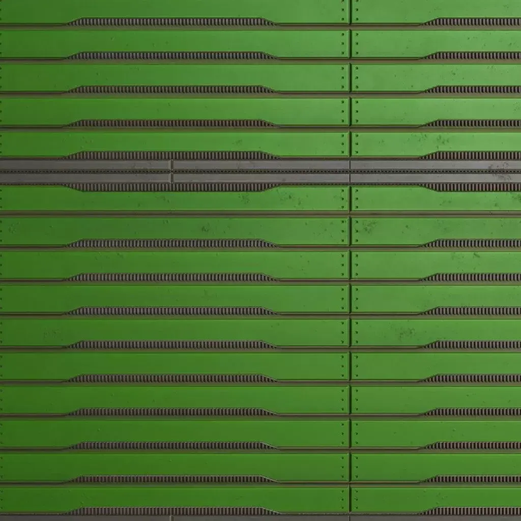 This is a high-quality PBR Texture Pack of a Green Sci-Fi Metal Panel.All essential Maps, including BaseColor, Normal, Roughness, Height, and Metallic, are provided to deliver a highly realistic and technologically advanced finish. This material features a sophisticated array of paneling, consisting of a structured grid of embossed square sections, each featuring recessed diagonal warning stripes and precise industrial grooves. The vibrant green metallic paint is accented with realistic edge wear and surface grime, making it an ideal choice for futuristic military installations, high-tech factory floors, sci-fi cargo holds, or specialized environment assets.