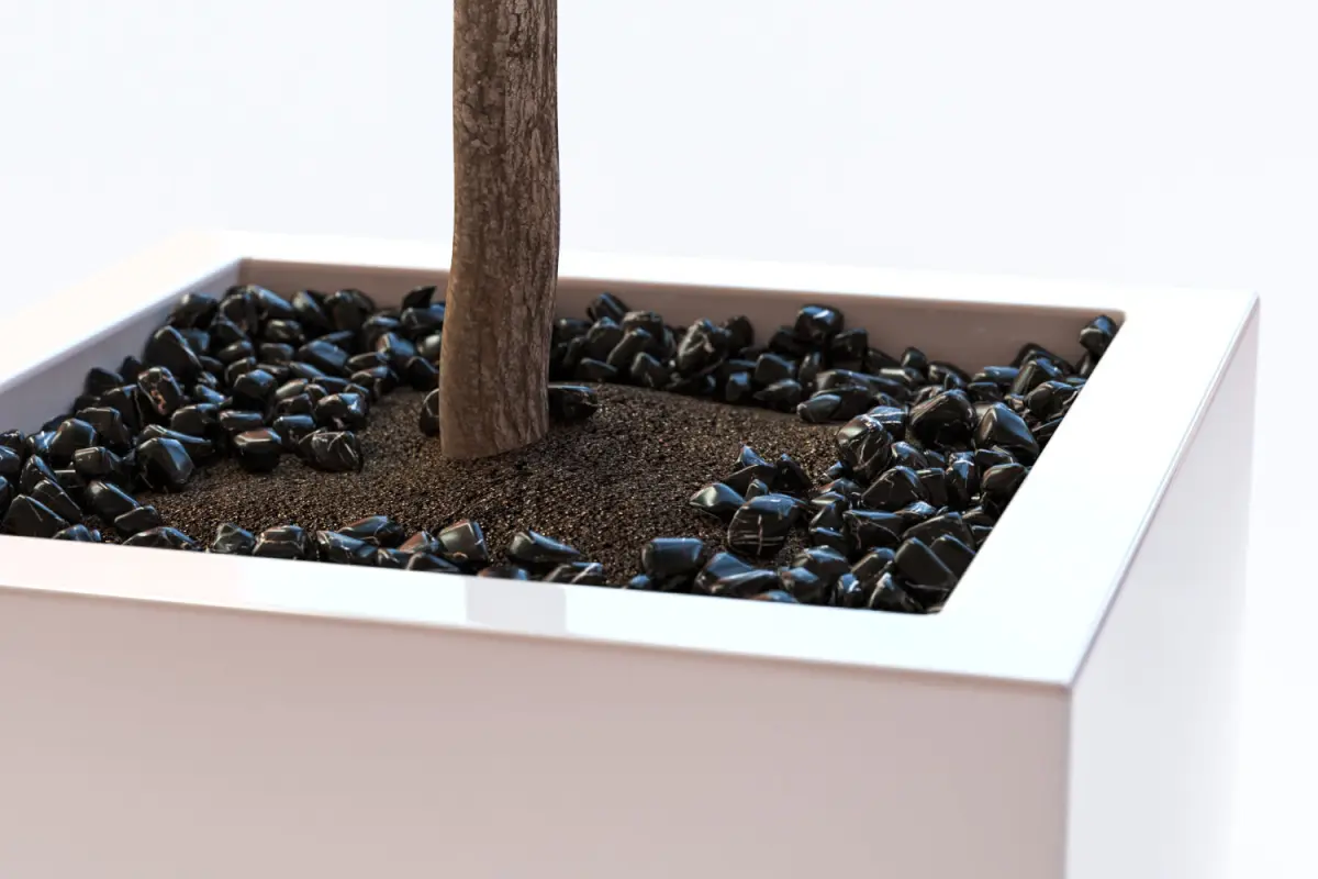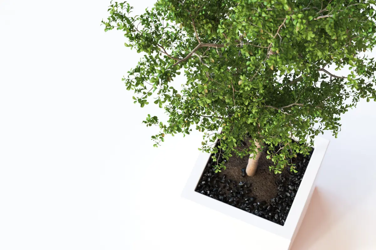 Modern decoration for home. The large green branched tree in a quarter ceramic pot with full of details.