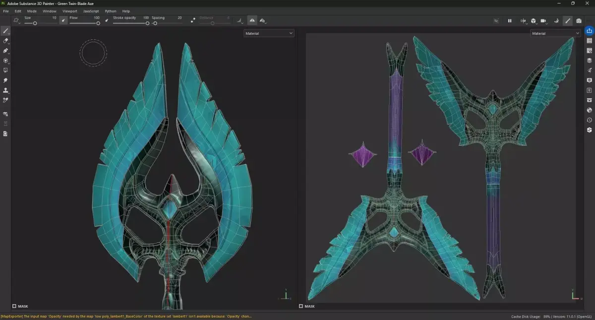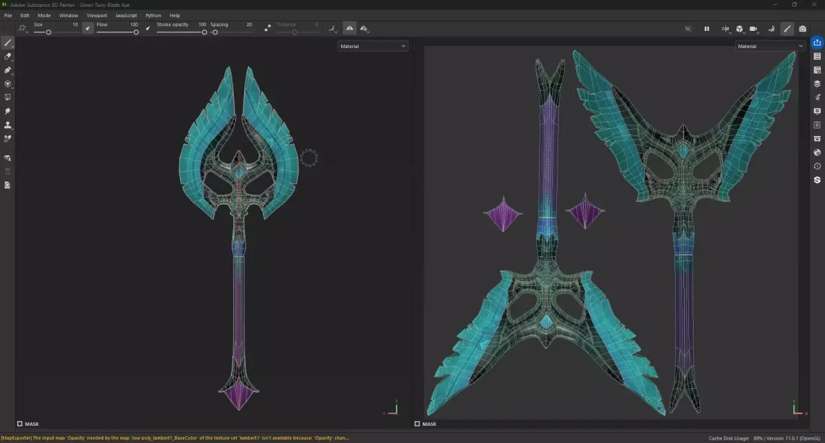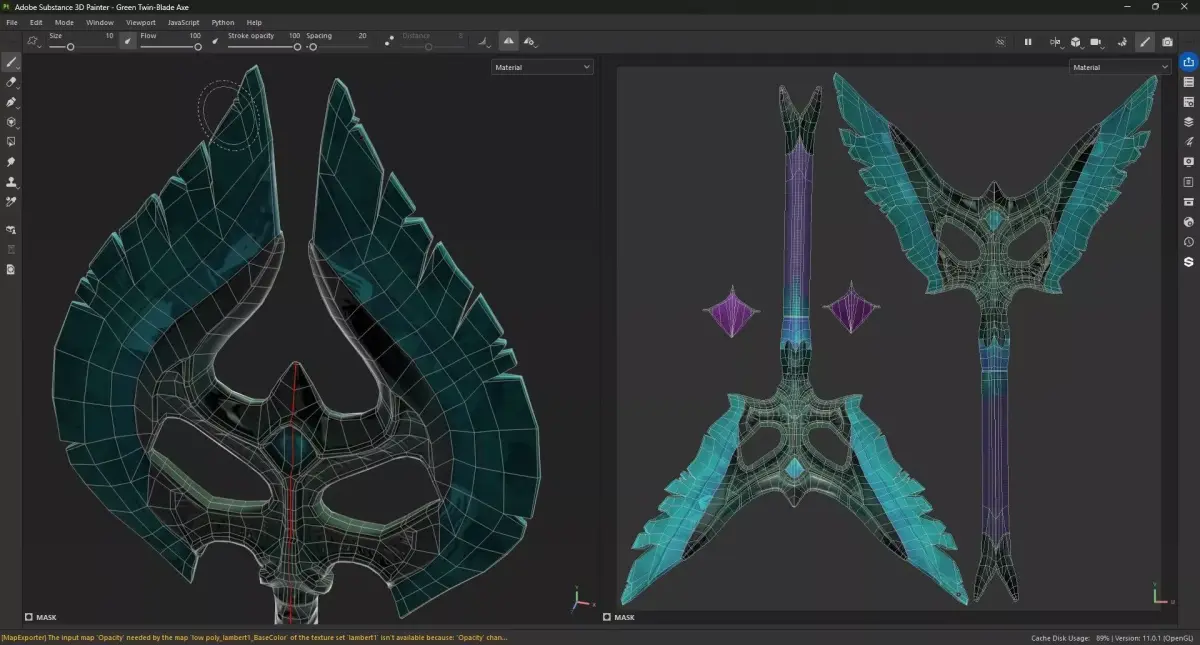 Green Twin-Blade Axe is a stylized fantasy weapon designed for games, cinematics, and real-time rendering projects. The axe features a unique twin-blade crescent design with sharp wing-like edges and an arcane-inspired center structure, giving it a mystical and powerful appearance suitable for fantasy RPG environments.