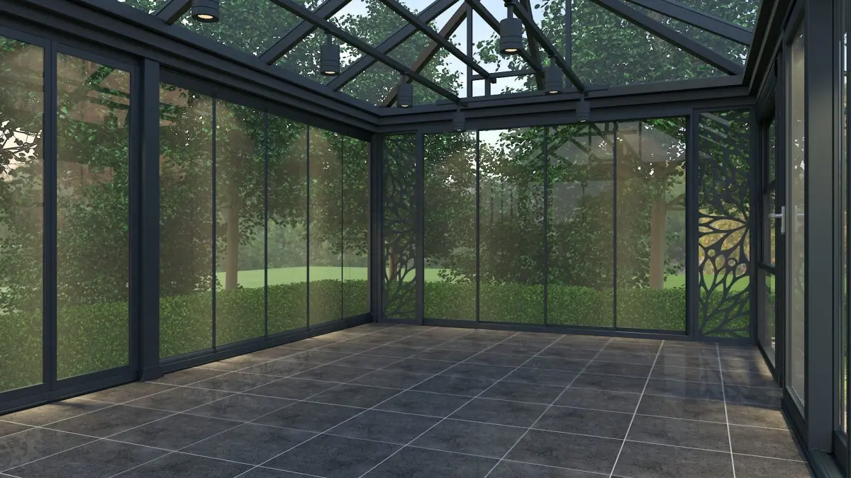 a modern green house design with six diffrent type of aluminum glass 1-glass roof 2-automatic vertical glass 3-sliding door glass system 4-isolated double glass sliding system 5-single glass folding system 6-double glass folding system.the aluminum profile color is RAL 7018 . Hope you like the model .