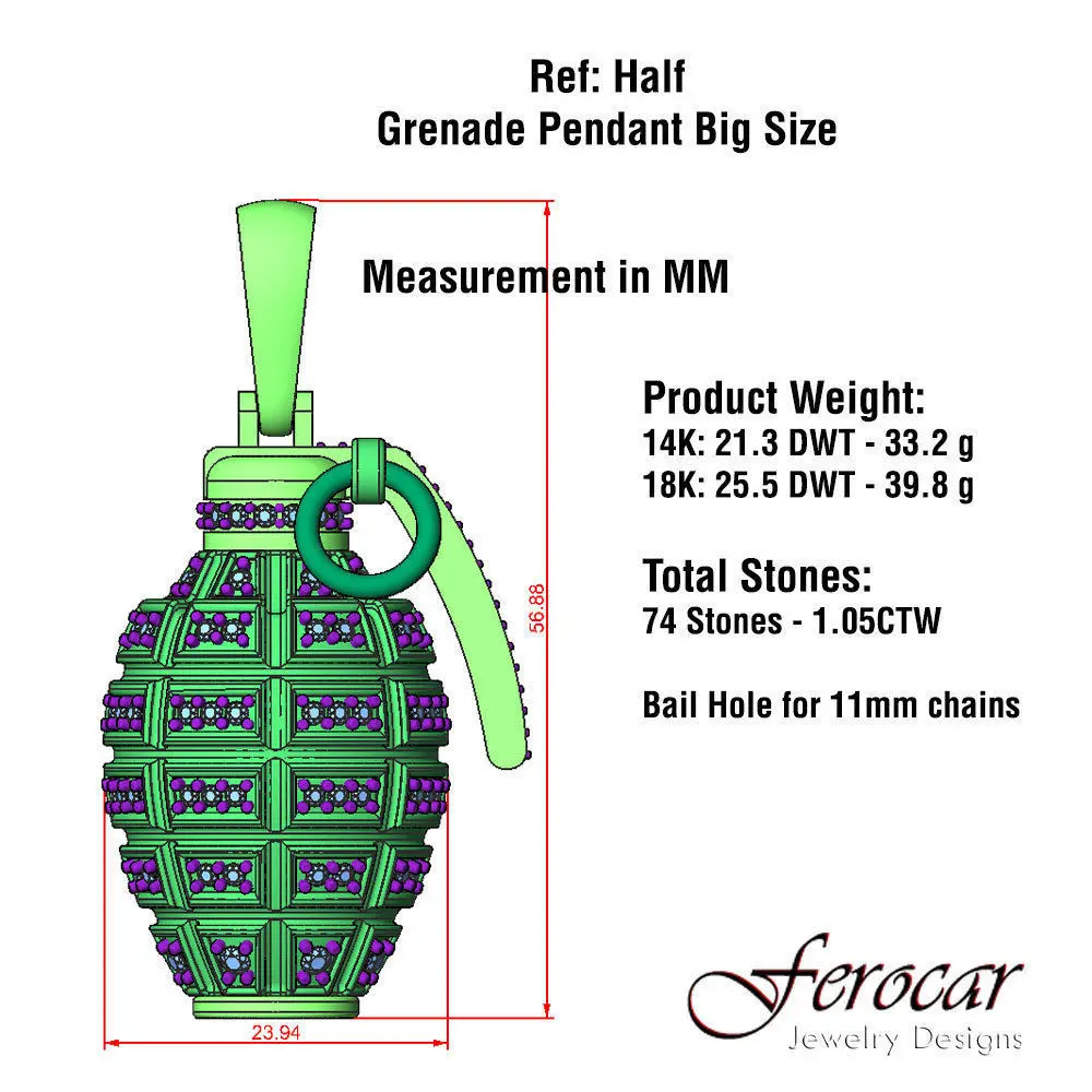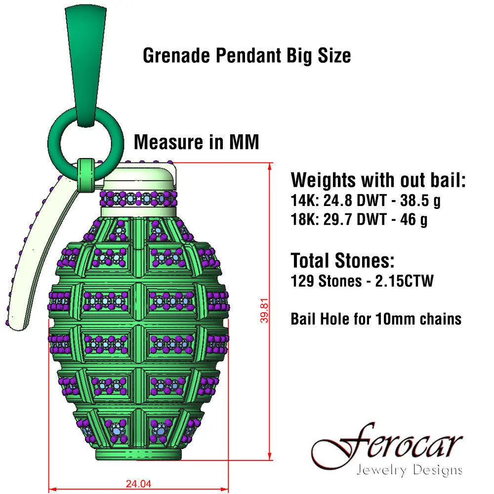 This a digital file for 3D print and production.FBX file with render color for blender.this is the redesign of my preview model less weigh more detail. Two designs in two different sizes of this amazing grenade pendant for a total of 4 models.Each design comes in a separated folder with a 3dm file, gem maps & specs info.also the design have been made in multiple parts so you can customized the gold colors.all the files are in 3DM format so you can open it in rhinoceros any other format request please contact me.