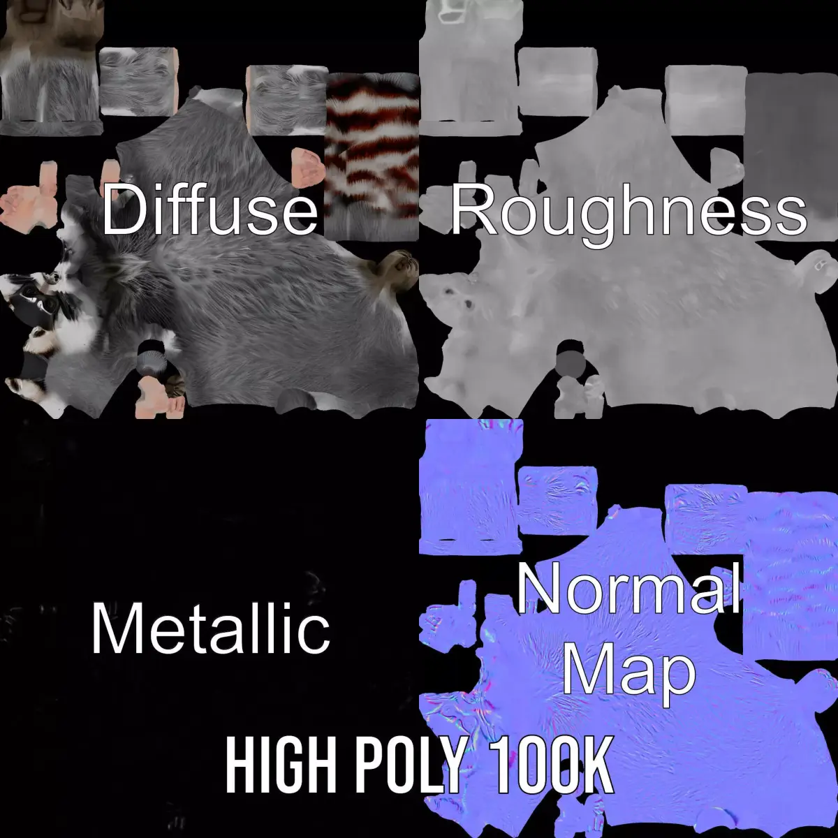 This 3D model pack features a highly detailed raccoon with realistic grey fur and distinct facial markings. Ideal for wildlife animations, virtual reality experiences, and educational simulations, this raccoon model enhances any digital scene with its lifelike appearance. Each model has 3 levels of detail: low-poly (1000 triangles for mobile), middle-poly (10,000 triangles for environment), and high-poly (100,000 triangles), which allows for the use of this model in production rendering (such as 3ds Max, Maya, Cinema4D, Blender, Vray, Corona, Cycles, and all others), game engines (Unity and Unreal compatible), and interactive presentations, providing a choice of detail based on the LOD System principle. The model's textures are PBR, Diffuse, NormalMap, and reflection/roughness/metallic, which are suitable for any modern rendering engine. All models accurately unwrapped and have no overlapping UVs. All textures are 4096*4096 in size. Please like and leave a comment for the model if you enjoy it.