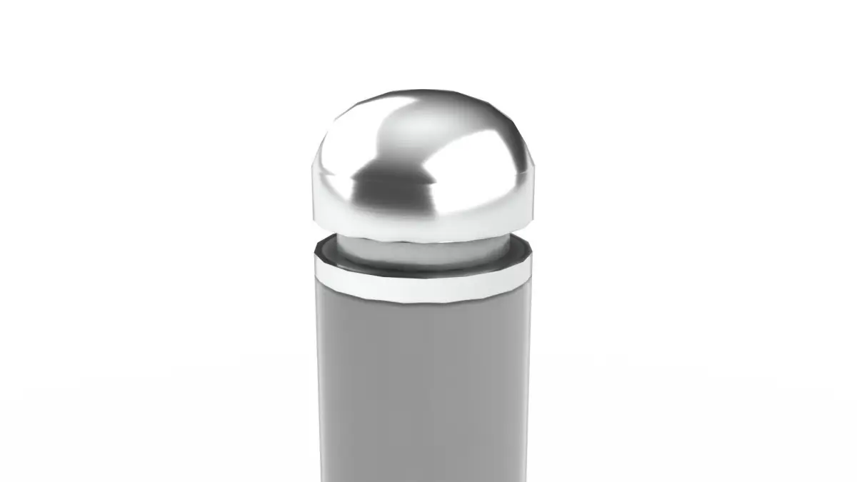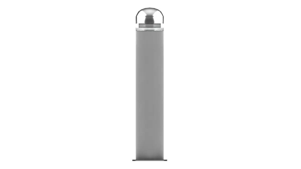 A contemporary grey cylindrical bollard, stainless steel stem with stylish single-collar dome top. Perfect for city or urban landscapes.
