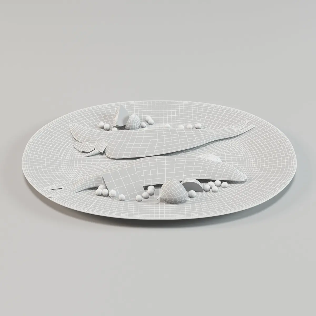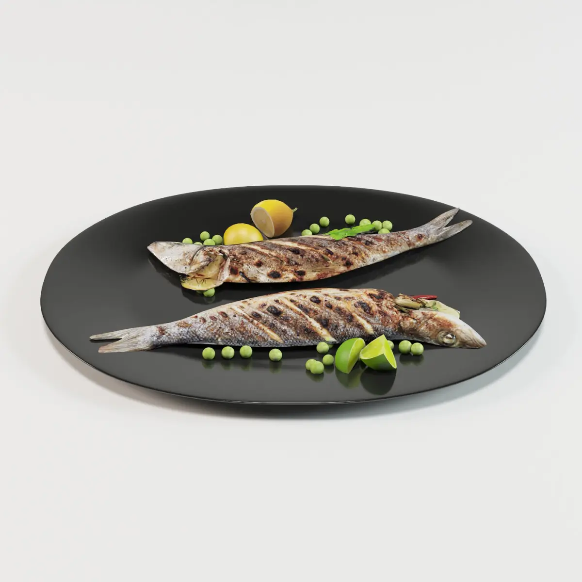 - the components of the meal are 2 whole branzino , ground pepper, lemon, Pea