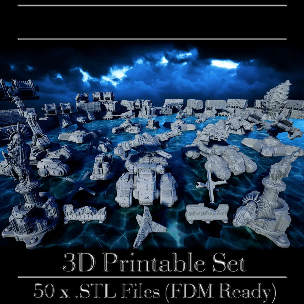 GrimDark Big Bundle offer highly detailed .STL files (Personal and Commercial Use) for 3D printing. This set you can easily use with miniatures that are 28-32mm scale (cyberpunk, grimdark, sci-fi tabletop wargames). You can print up to higher size due to its detail. Each element can be print on FDM/ Resin printer (files are not Pre-Supported).
