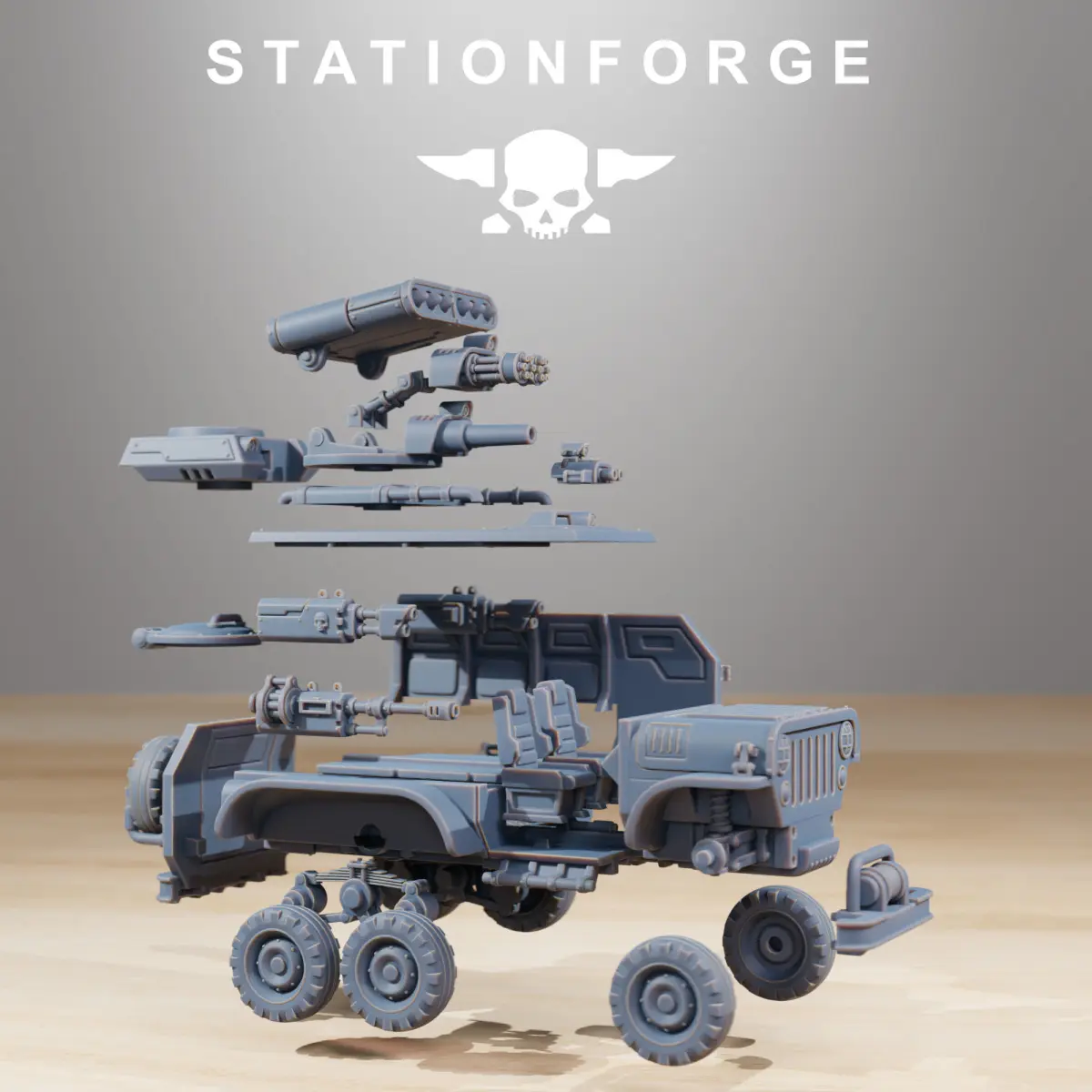 Includes:8 GrimGuards2 Machine Turret Options1 Rocket Launcher2 side weapon options1 Small Machine Gun TurretPin Holes for the roof in case you want to see the crew once in a while