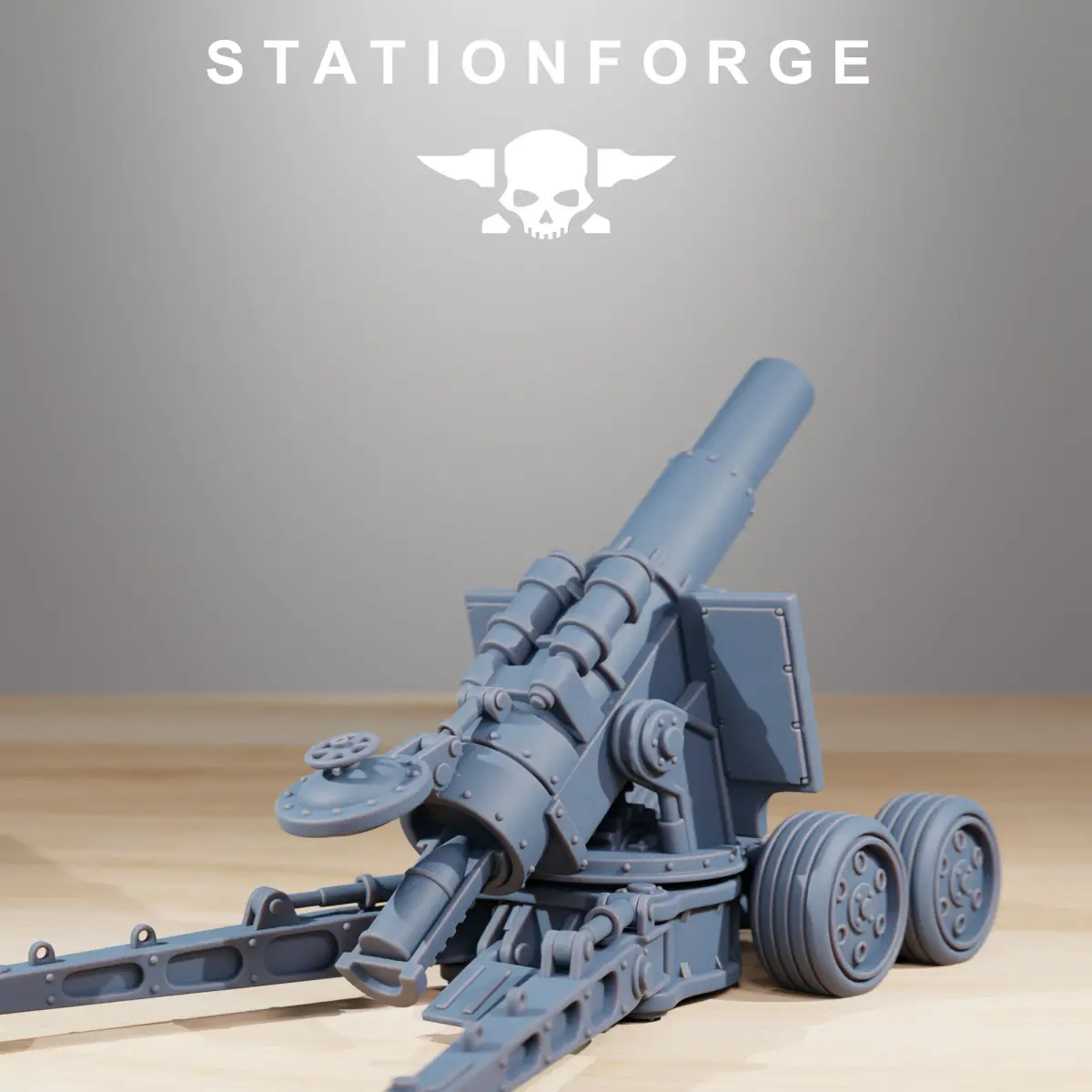 Includes: 2 canon variations, each with an open or closed hatch and two ways of transportation using wheels or treads. Artillery is being operated with the help of 8 crew members.