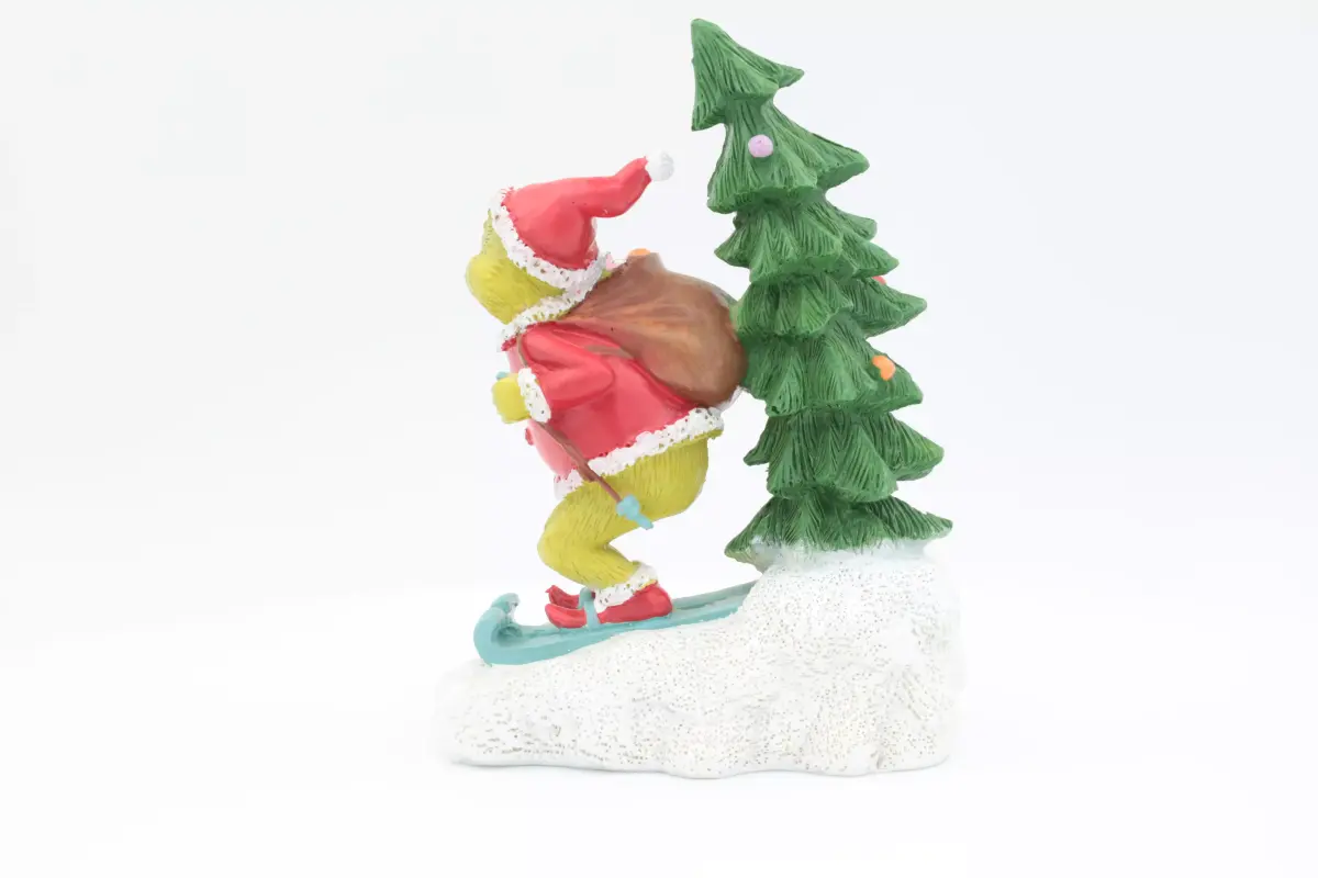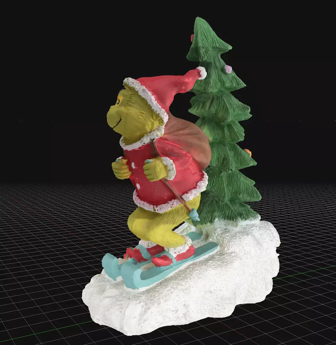A detailed 3D model of a festive Christmas scene featuring a mischievous green character dressed in a red Santa outfit, skiing down a snowy slope. He carries a large sack of gifts on his back and is placed beside a decorated Christmas tree. The model includes bright colors, playful details, and a cheerful holiday atmosphere, making it ideal for use in Christmas graphics, animations, product mockups, seasonal marketing, and winter-themed designs.
