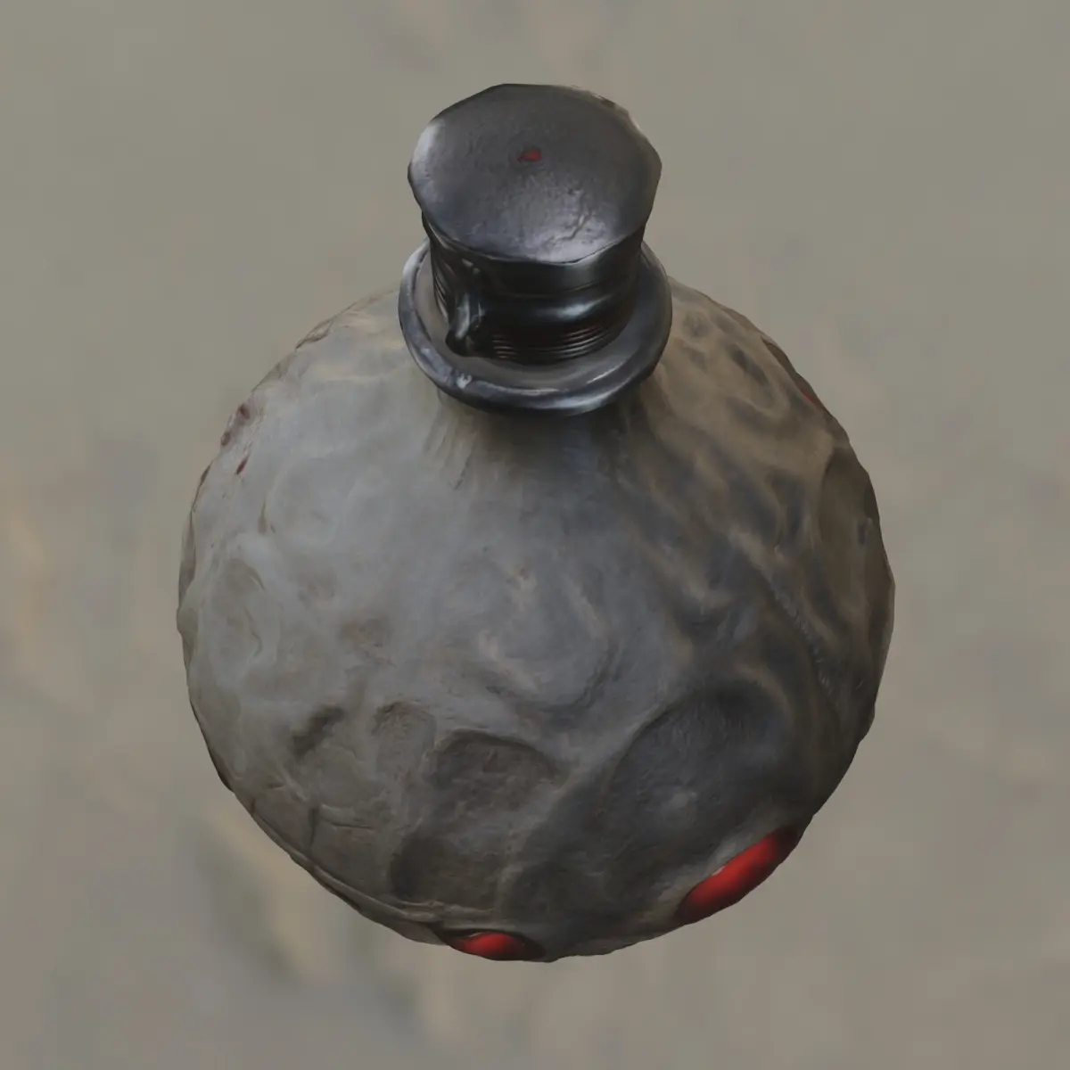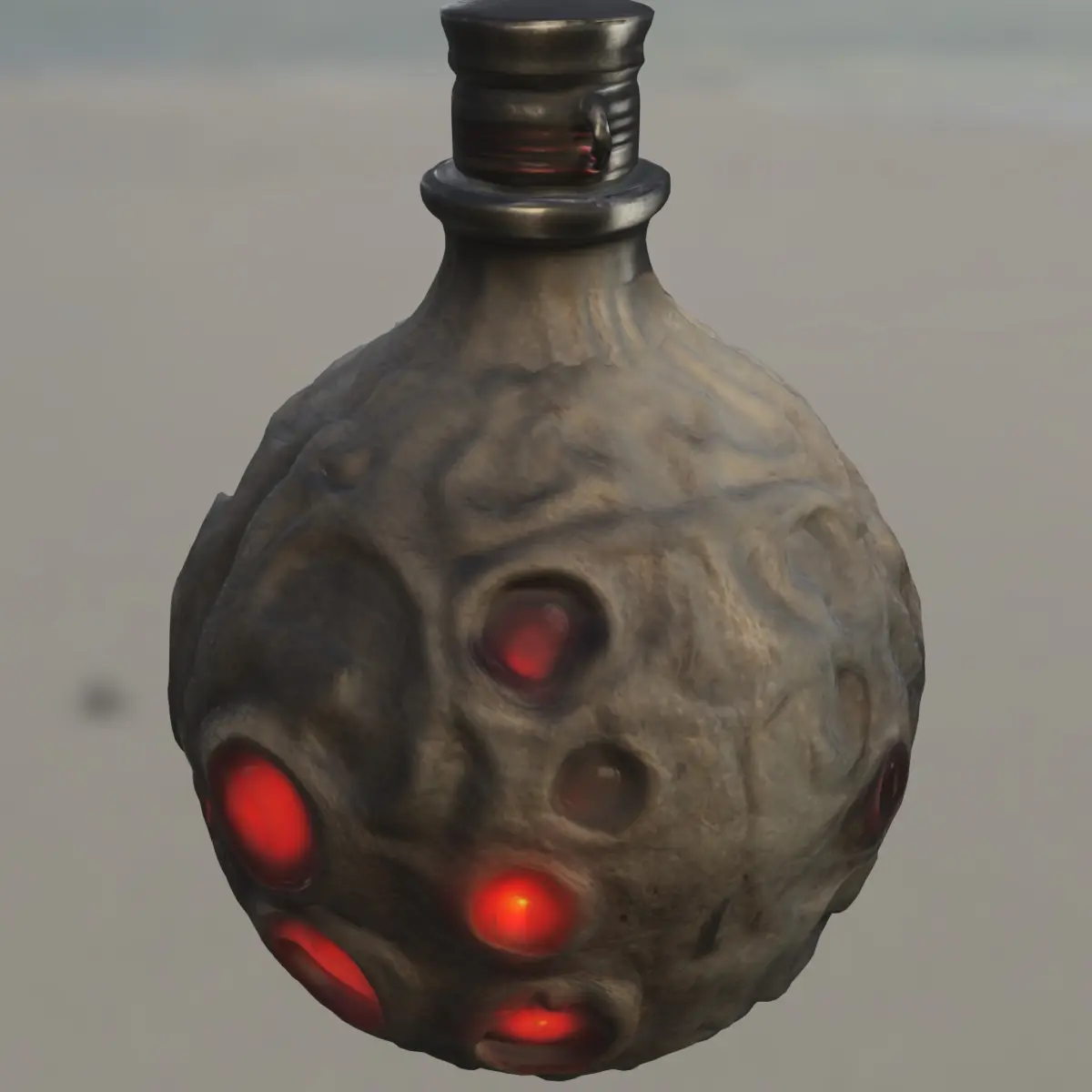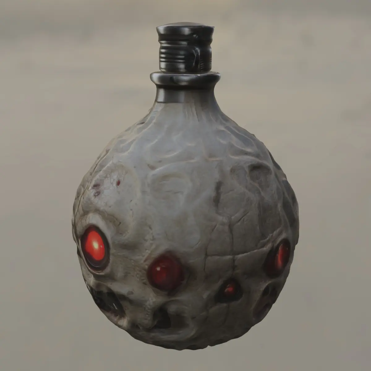 This grotesque 3D model depicts a round flask shaped like a wicked, grinning skull with glowing red eyes, ideal for dark fantasy or horror environments. Perfect for use as a cursed elixir, monster soul vessel, or demonic power container in popular games like Dark Souls, Diablo IV, Bloodborne, Elden Ring, or Skyrim. This asset is ready for game development and 3D printing, with files included in OBJ, FBX, STL, DAE, PLY, and GLB formats, compatible with Unreal Engine, Unity, and other major platforms.