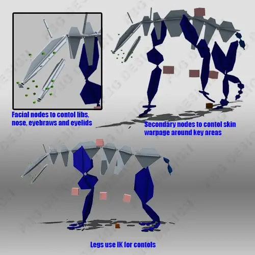walk, run, standing walk, standing idle, standing claw swip and douple swipe, standing roar, claw swipe, douple claw swipe, Biting, roaring, dodge left, dodge right, dodge backward.