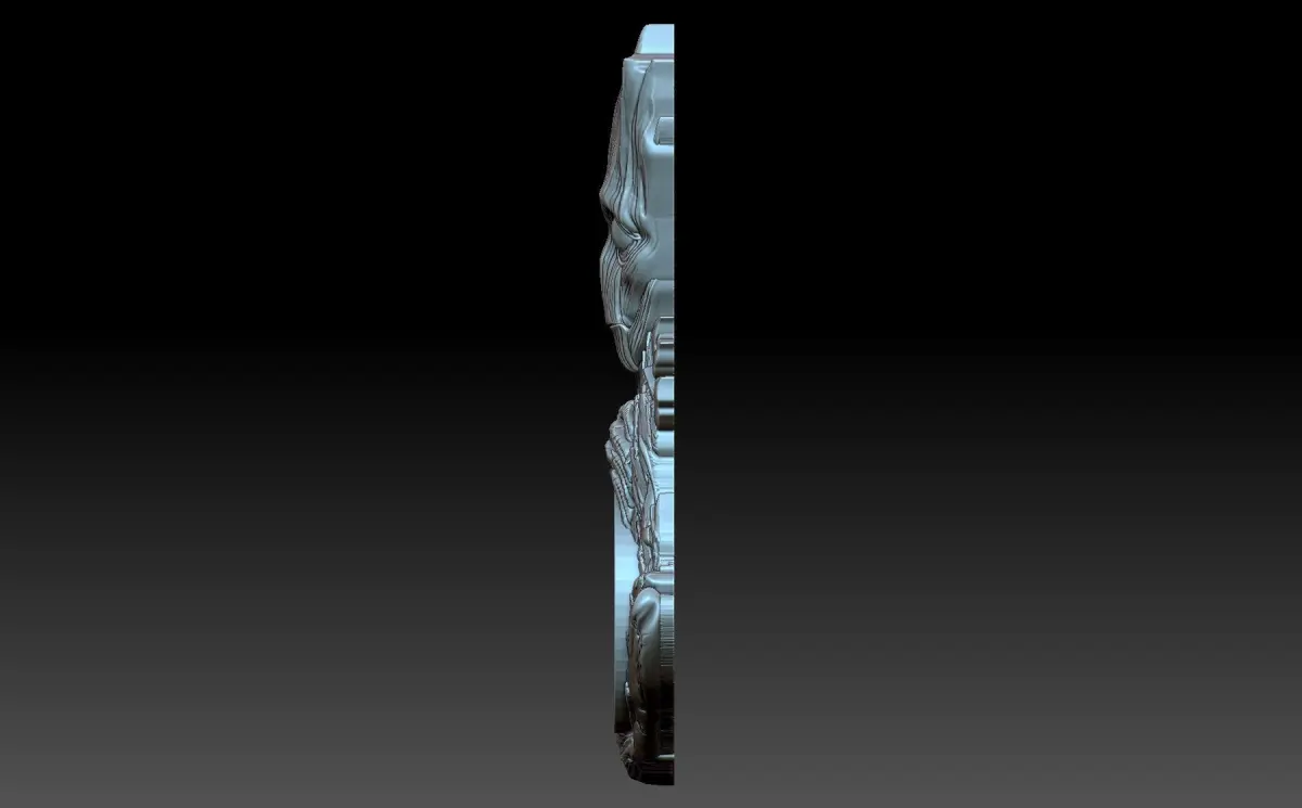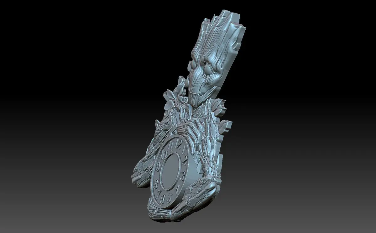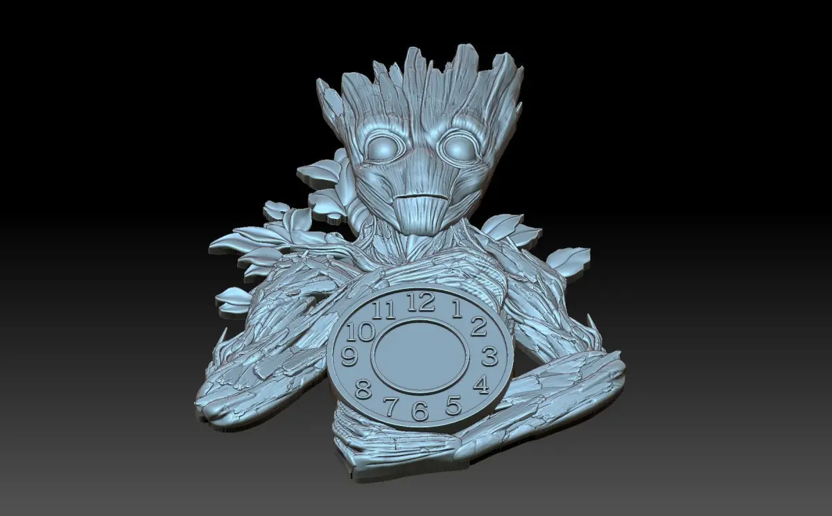A 3D model of a bas-relief depicting the famous character Groot. Groot is holding a watch in his hands, an interesting job. The work is suitable for 3D printing and CNC machine tools.