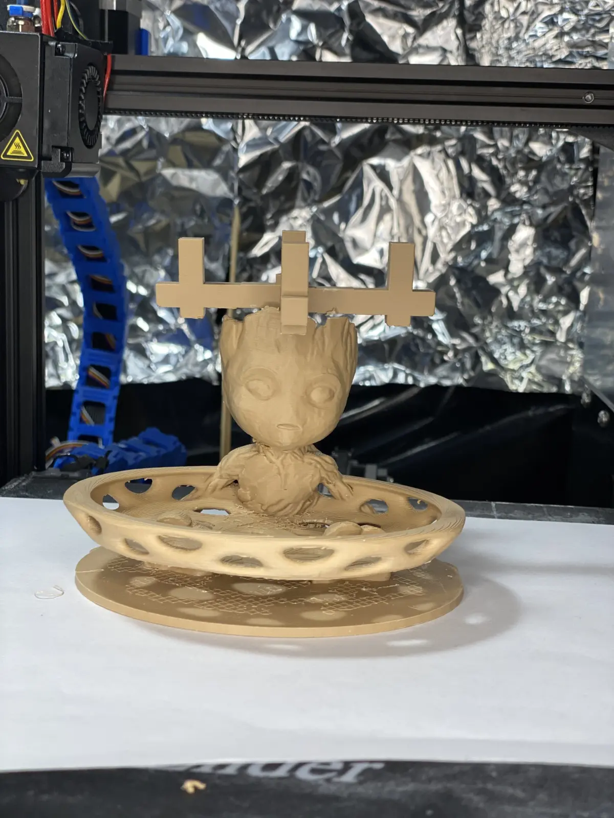Hello welcome to Designz By JJS. Here is a New 3D Printed model of a Groot Multi Holder. A design That I have made and decided to 3d print. There will Be Plenty in stock. Also if you would like different sizes. CONTACT BEFORE PURCHASE. The Groot Multi Holder a Basket that rests with the 3d Groot model. It looks as if the 3d basket is growing out of the Groot. Also There is a Post on top with 4 posts across. It is about 6H x 4.5 wide.