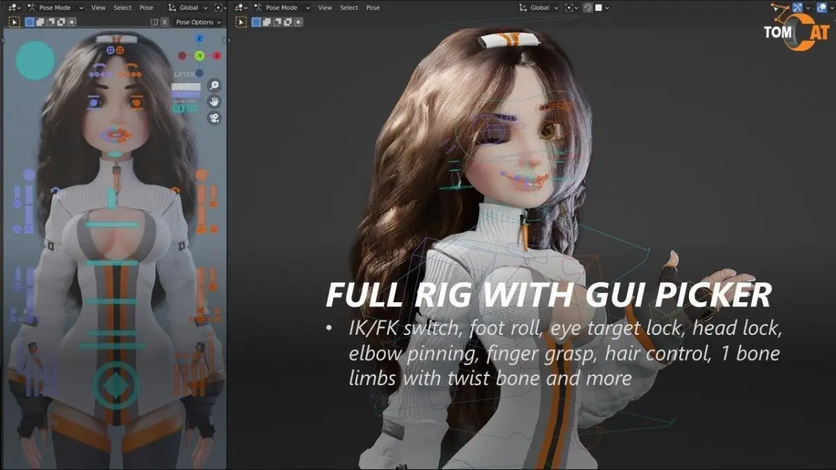 IK/FK switch, foot roll, eye target lock, head lock, elbow pinning, finger grasp, hair control, 1 bone limbs with twist bone and more