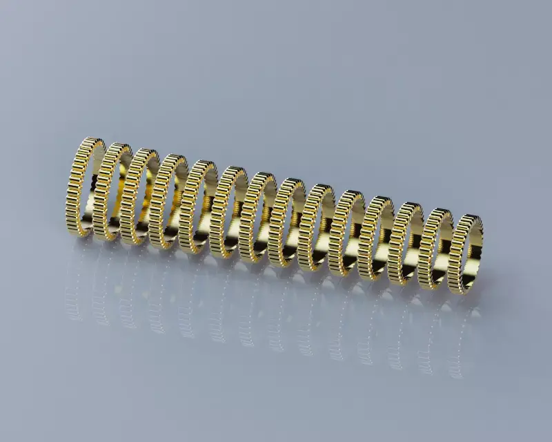 This collection of rings is ready for 3D printing.Ring sizes(Korean Standart) 7 8 9 10 11 12 13 14 15 16 17 18 19 20 . Approximate weight of rings by size(GOLD 14K): 7-2.64g 8-2.67g 9-2.73g 10-2.76g 11-2.82g 12-2.88g 13-2.91g 14-2.97g 15-3.04g 16-3.06g 17-3.13g 18-3.15g 19-3.21g 20-3.28g. Width - 3.2 mm. Thickness - 1.5mm. I can make to order with your parameters.