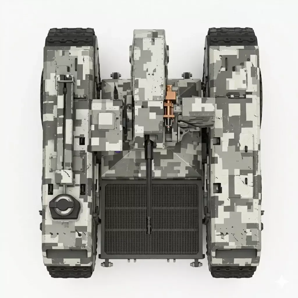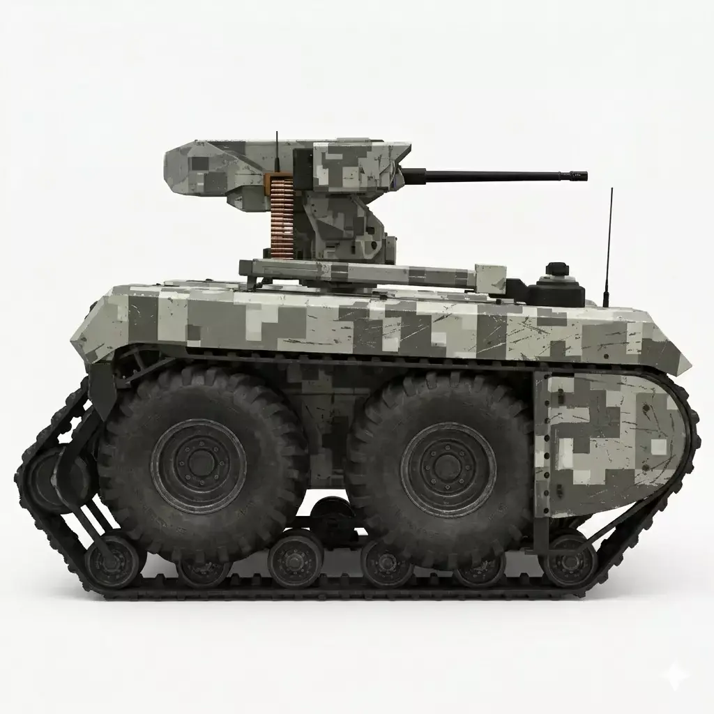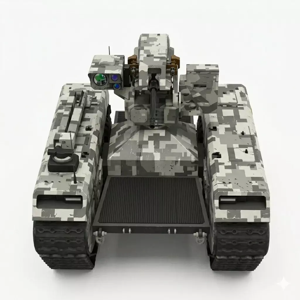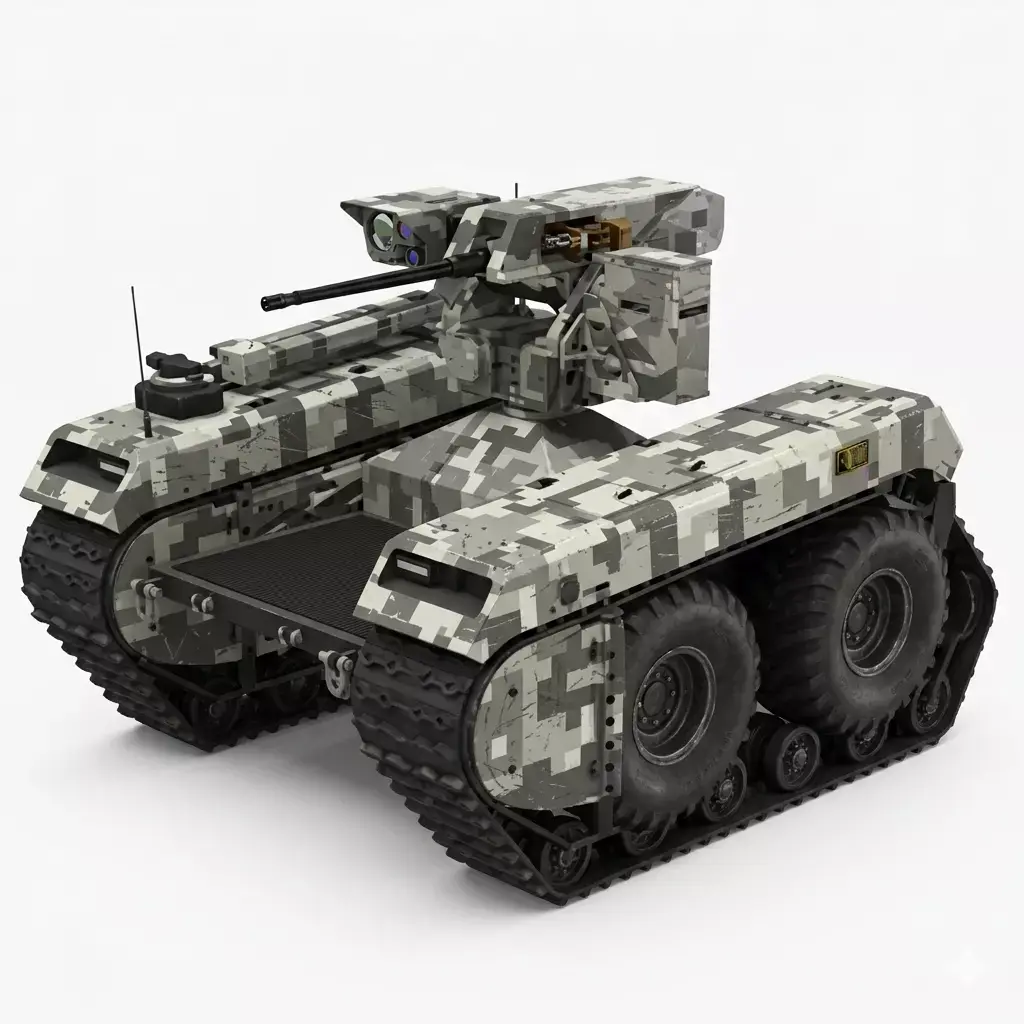 This advanced Unmanned Ground Vehicle (UGV) is designed for high-stakes reconnaissance and tactical support in diverse environments. Featuring a ruggedized, all-terrain hybrid drive system, the vehicle utilizes a unique track-over-wheel configuration to ensure maximum mobility over soft soil, debris, and steep inclines. The platform is draped in a digital urban camouflage pattern and is equipped with a sophisticated Remote Weapon Station (RWS) mounted on a central 360-degree turret. This combat module integrates a high-caliber machine gun alongside an electro-optical sensor suite, including thermal imaging and a laser rangefinder for precise target acquisition. Engineered for remote operation or autonomous waypoint navigation, this tactical robot serves as a force multiplier, providing a low-profile, high-impact solution for modern perimeter defense and hazardous zone exploration.