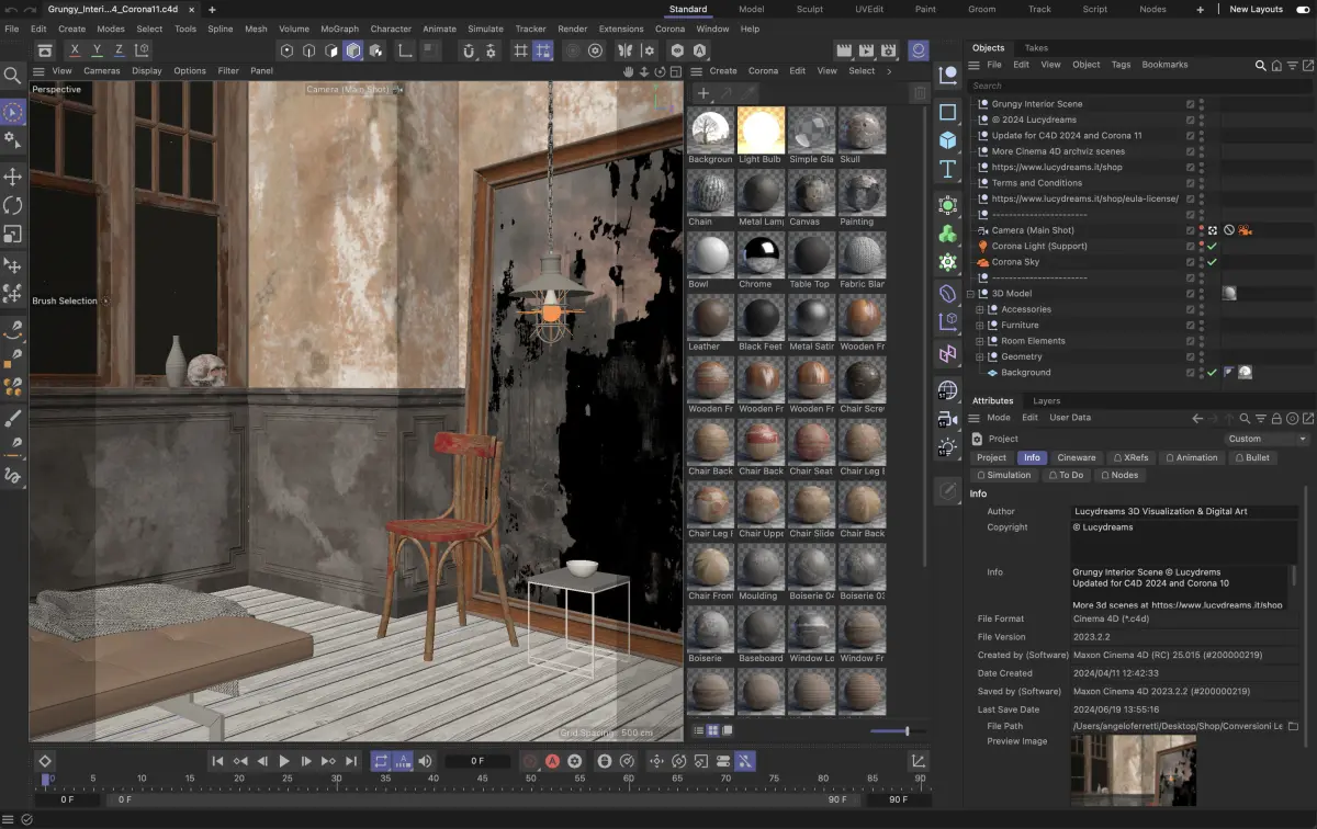 Grungy interior scene is now updated for Cinema 4D 2024 and Corona 11, including Physical materials (no more Legacy materials), new VFB setup for a better look (the renders need no more post production with Photoshop), new Corona Sky setup for a more natural result, a bunch of new props, a background image to make it more realistic, faster render times and a few more improvements to the 3d models and textures projections.
