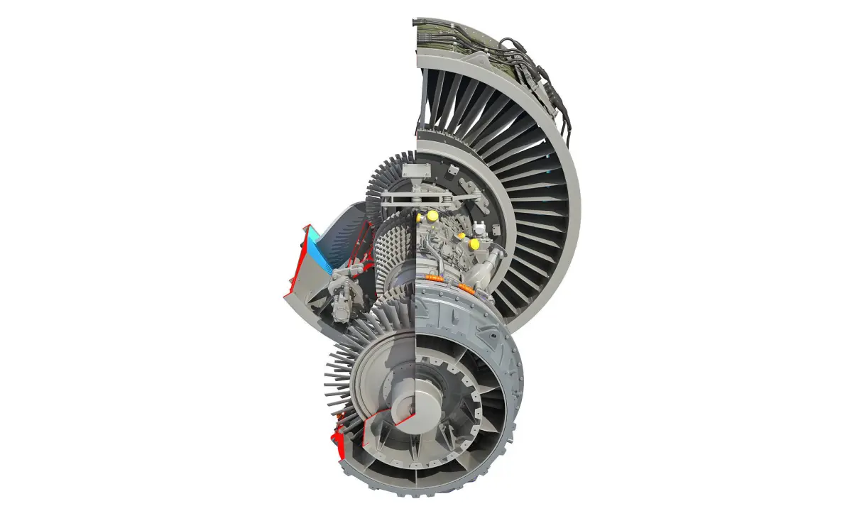 Extremely detailed cutaway 3d model of GTF geared turbofan engine.
