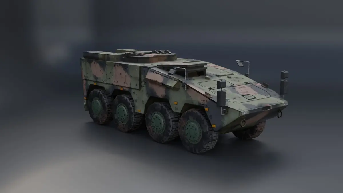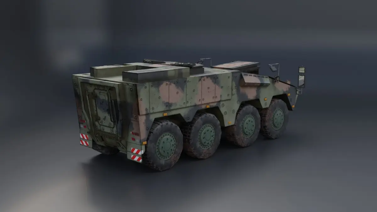 GTK Boxer German military truck 6x6. There is no animation or rigging in this model. It is made as hardsurface only. Even the doors are not retractable.verticles : 7793edges : 14468faces: 6775Triangles : 14370