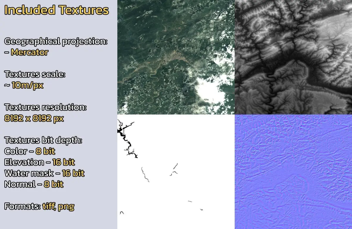 Warning: minor clouds/artifacts may be present on the diffuse color satellite texture due to the nature of the dataset. Check product images.