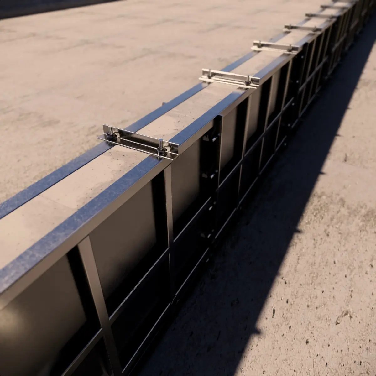 Forma metálica para fabricação de guarda-rodas tipo New JerseyForma em módulos de 1,50 mForma confeccionada em cahapa dobrada #3,00 mmNervurada com perfil tipo U em chapa dobrada #2,00 mmFlanges de emenda em barra chata perfurada #6,35 mm